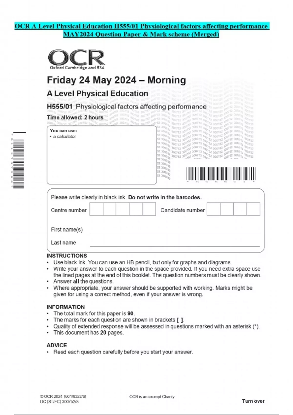 OCR A Level Physical Education H555/01 Physiological factors affecting performance MAY2024 Question Paper & Mark scheme (Merged)
