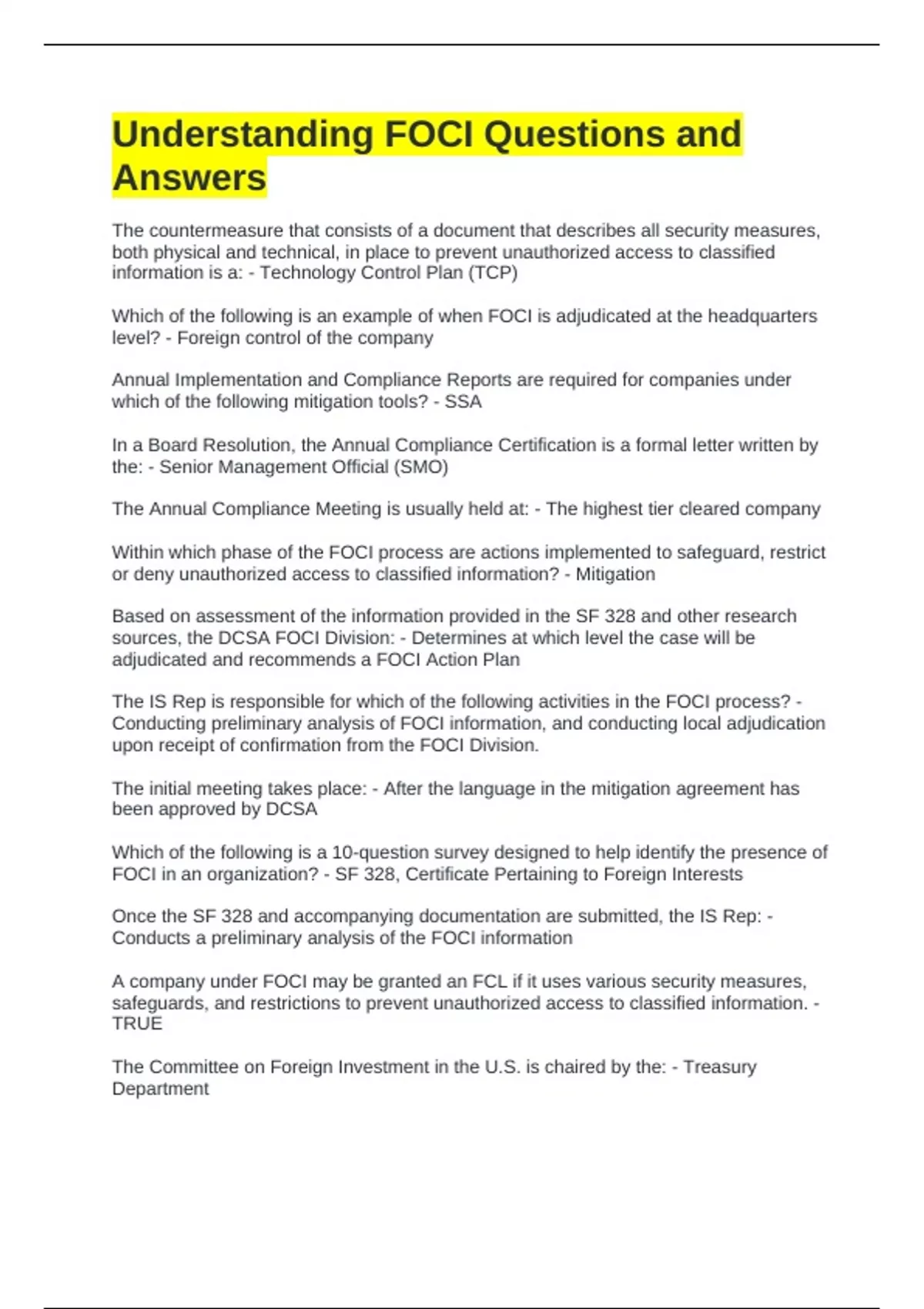 Understanding FOCI Questions and Answers The countermeasure that consists of a document that describes all security measures, both physical and technical, in place to prevent unauthorized access to classified information is a: Technology Control Plan (TCP) Which of the following is an example of when FOCI is adjudicated at the headquarters level? Foreign control of the company Annual Implementation and Compliance Reports are required for companies under which of the following mitigation tools? SSA In a Board Resolution, the Annual Compliance Certification is a formal letter written by the: Senior Management Official (SMO) The Annual Compliance Meeting is usually held at: The highest tier cleared company Within which phase of the FOCI process are actions implemented to safeguard, restrict or deny unauthorized access to classified information? Mitigation Based on assessment of the information provided in the SF 328 and other research sources, the DCSA FOCI Division: Determines at which level the case will be adjudicated and recommends a FOCI Action Plan The IS Rep is responsible for which of the following activities in the FOCI process? Conducting preliminary analysis of FOCI information, and conducting local adjudication upon receipt of confirmation from the FOCI Division. The initial meeting takes place: After the language in the mitigation agreement has been approved by DCSA Which of the following is a 10-question survey designed to help identify the presence of FOCI in an organization? SF 328, Certificate Pertaining to Foreign Interests Once the SF 328 and accompanying documentation are submitted, the IS Rep: Conducts a preliminary analysis of the FOCI information A company under FOCI may be granted an FCL if it uses various security measures, safeguards, and restrictions to prevent unauthorized access to classified information. TRUE The Committee on Foreign Investment in the U.S. is chaired by the: Treasury Department Before the FOCI factors can be analyzed, they must be accurately identified and understood within the context of the organization's need for a facility clearance. TRUE Which of the following FOCI action plans requires an initial meeting between company and DCSA representatives? e. All of the above (a.Special Security Agreements b.Voting Trust Agreements c.Proxy Agreements d.Security Control Agreements) DCSA will accept the Annual Implementation and Compliance Report from a contractor in the form of: A formal letter written by the company's Senior Management Official to the Field Office submitted through the designated system of record in advance of the annual review Question 1 of the SF 328 asks about foreign ownership of the organization. The question should be answered "yes" if any foreign entity owns ____ percent or more of company's stock. 5 During part 2 of the Annual Compliance Meeting, the DCSA representatives meet with the expanded group of attendees to: Discuss compliance with special controls and procedures established to mitigate FOCI Under what circumstances may a Limited Facility Clearance (Limited FCL) be granted? all of the above Additional, tailored security education and threat briefings may be required at the local level for companies with FOCI. TRUE