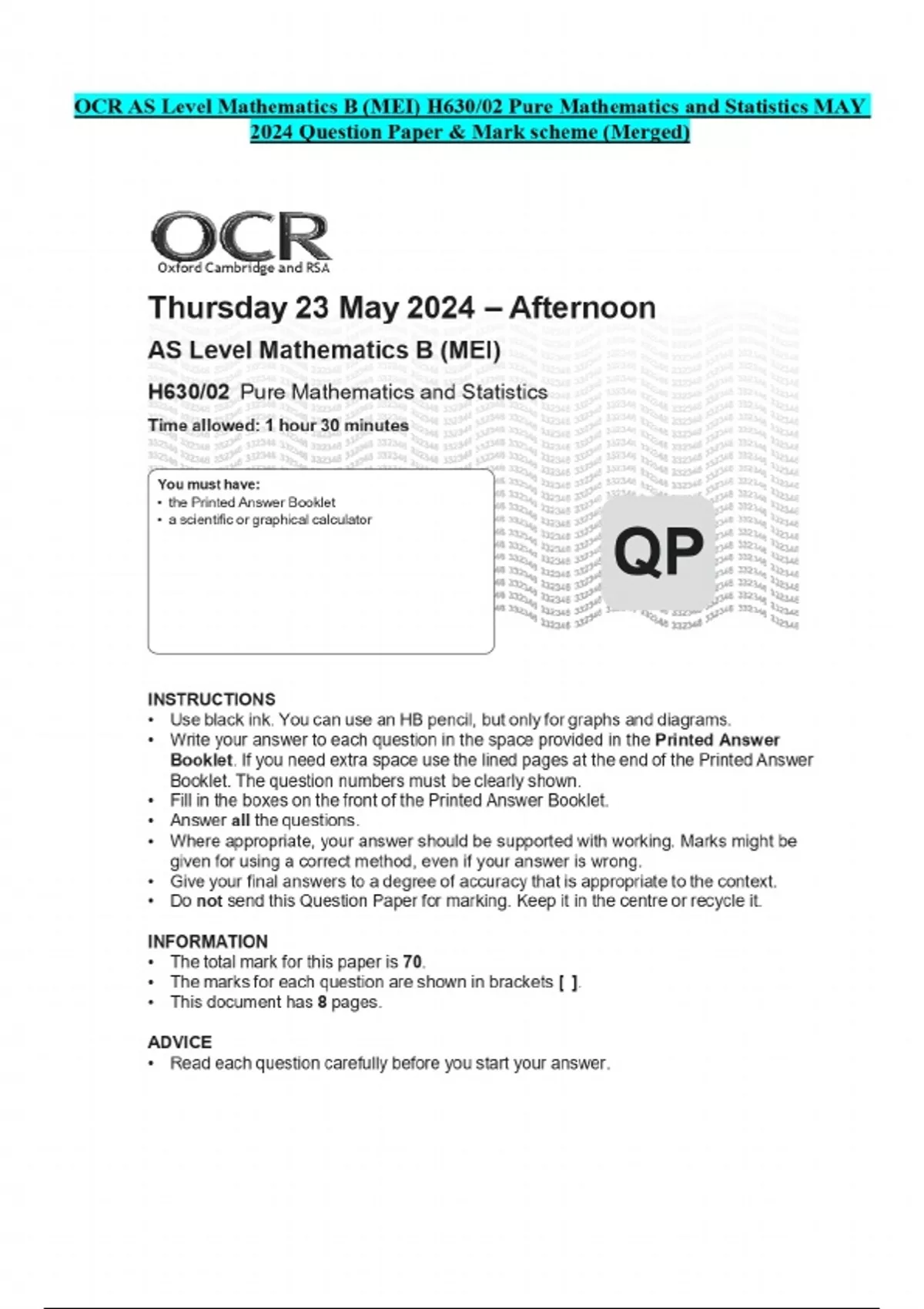 OCR AS Level Mathematics B (MEI) H630/02 Pure Mathematics and Statistics MAY 2024 Question Paper & Mark scheme (Merged)