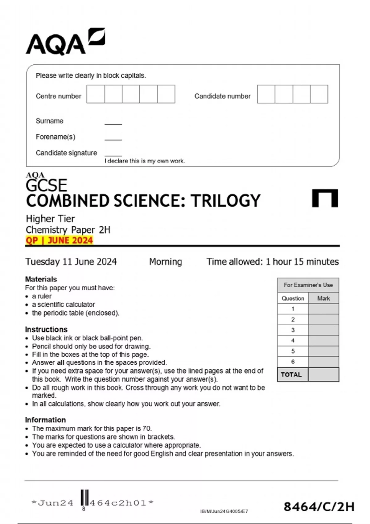 AQA GCSE COMBINED SCIENCE: TRILOGY HHigher Tier Chemistry Paper 2H QP | JUNE 2024