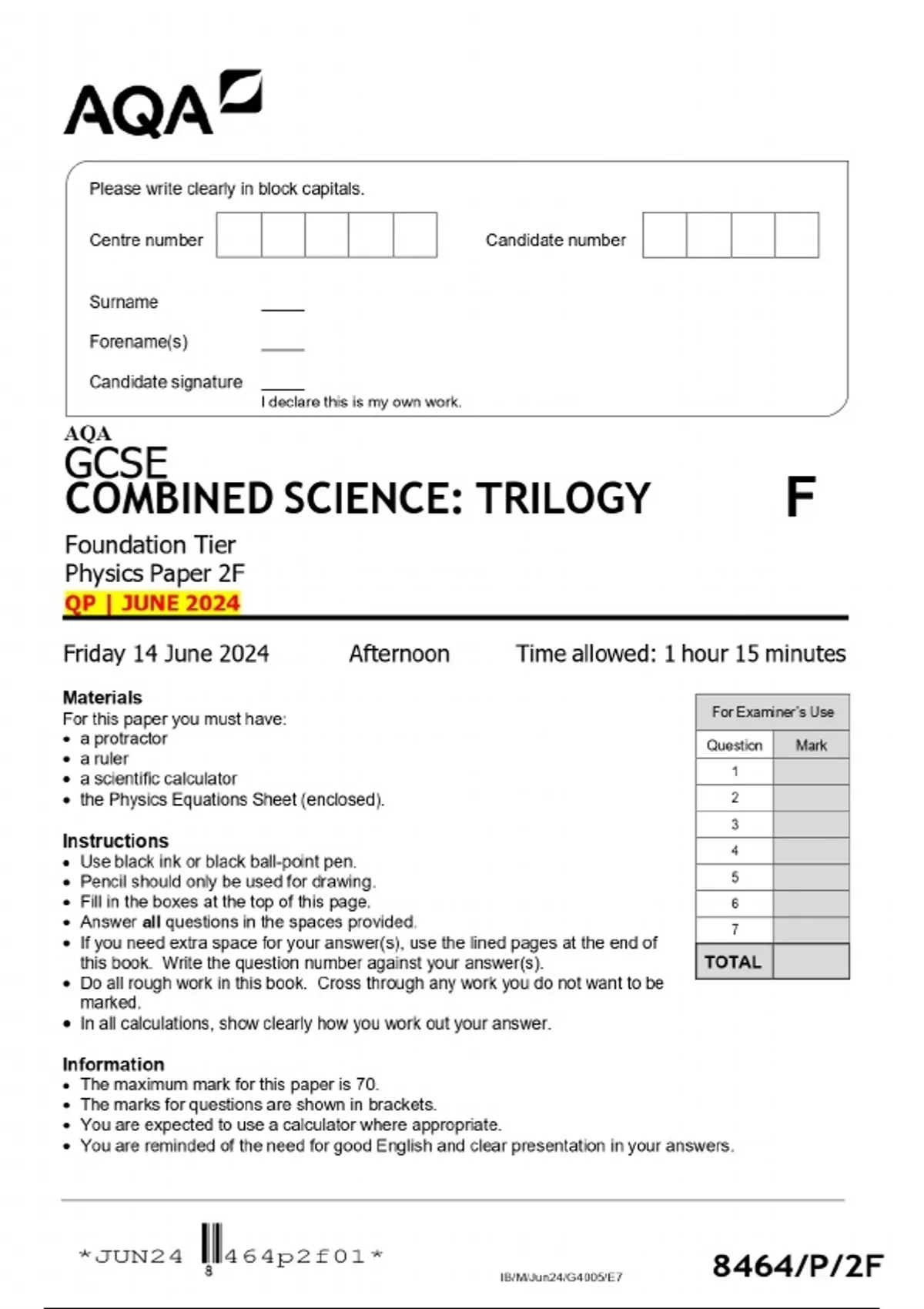 AQA GCSE COMBINED SCIENCE: TRILOGY F Foundation Tier Physics Paper 2F QP | JUNE 2024