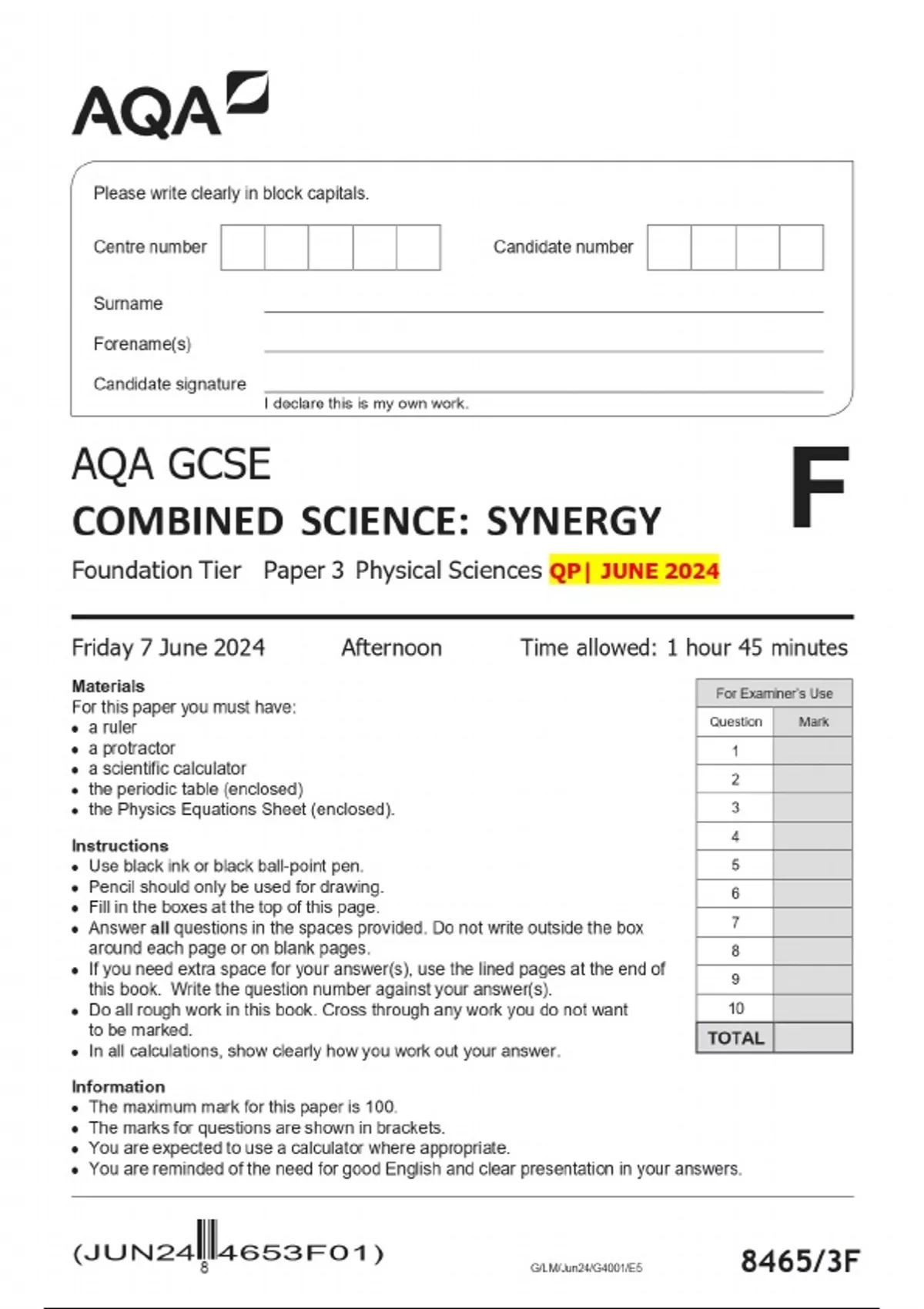 AQA GCSE COMBINED SCIENCE: SYNERGY Foundation Tier Paper 3 Physical Sciences QP| JUNE 2024