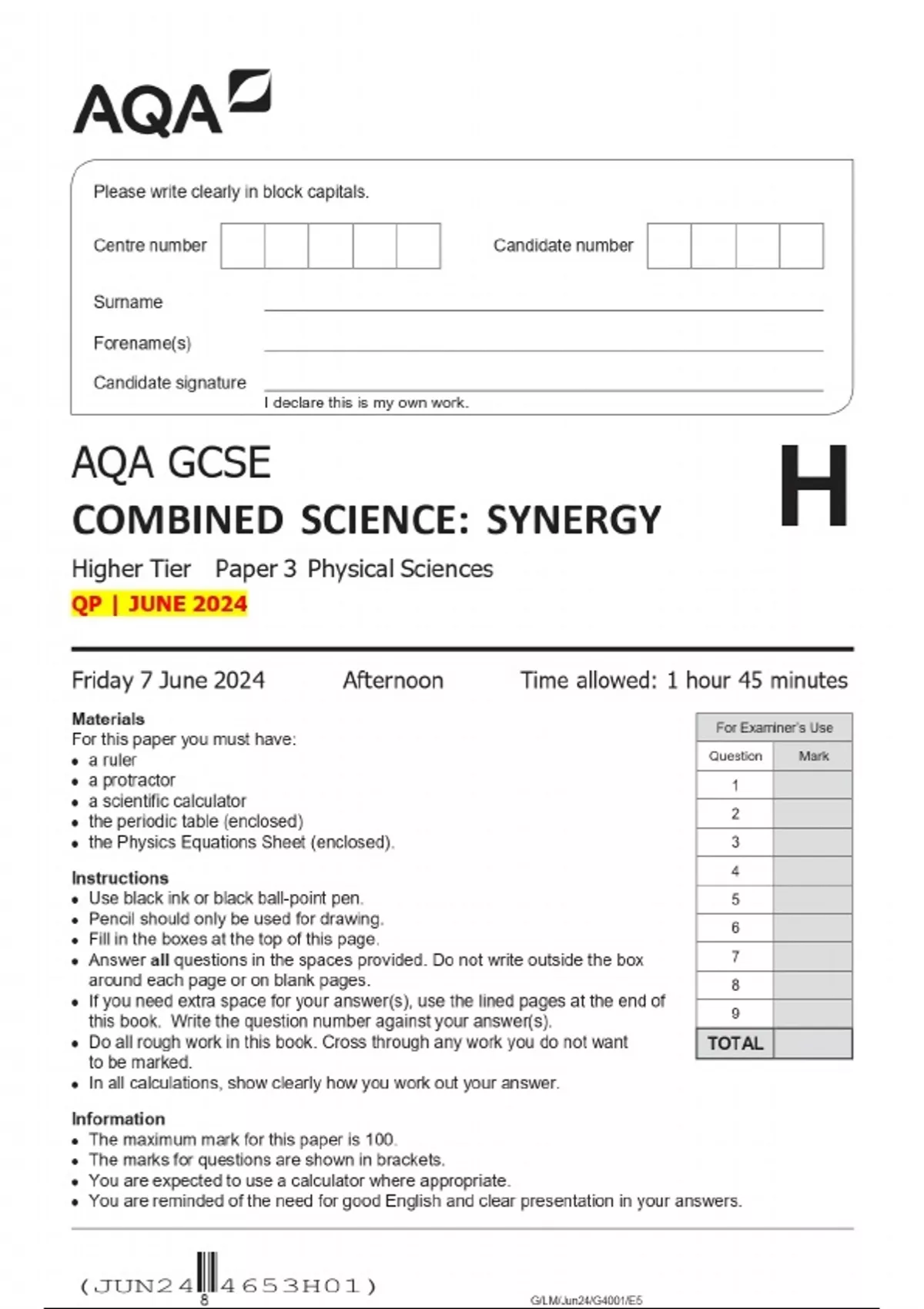 AQA GCSE COMBINED SCIENCE: SYNERGY Higher Tier Paper 3 Physical Sciences QP | JUNE 2024