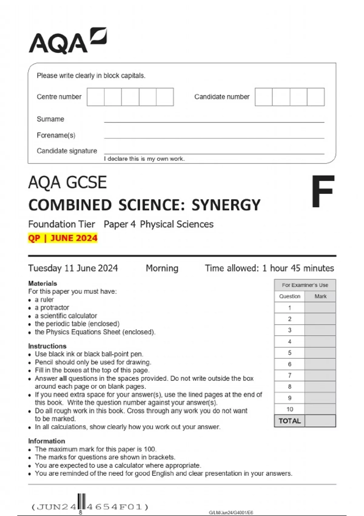 AQA GCSE COMBINED SCIENCE: SYNERGY Foundation Tier Paper 4 Physical Sciences QP | JUNE 2024