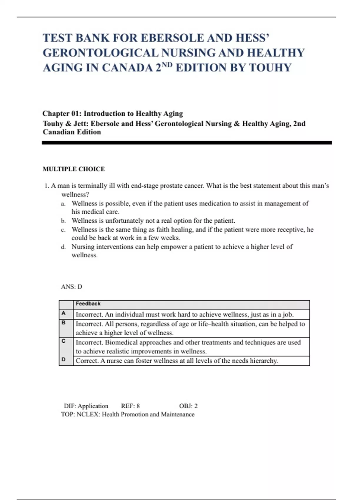 TEST BANK FOR EBERSOLE AND HESS’ GERONTOLOGICAL NURSING AND HEALTHY AGING IN CANADA 2ND EDITION BY TOUHY