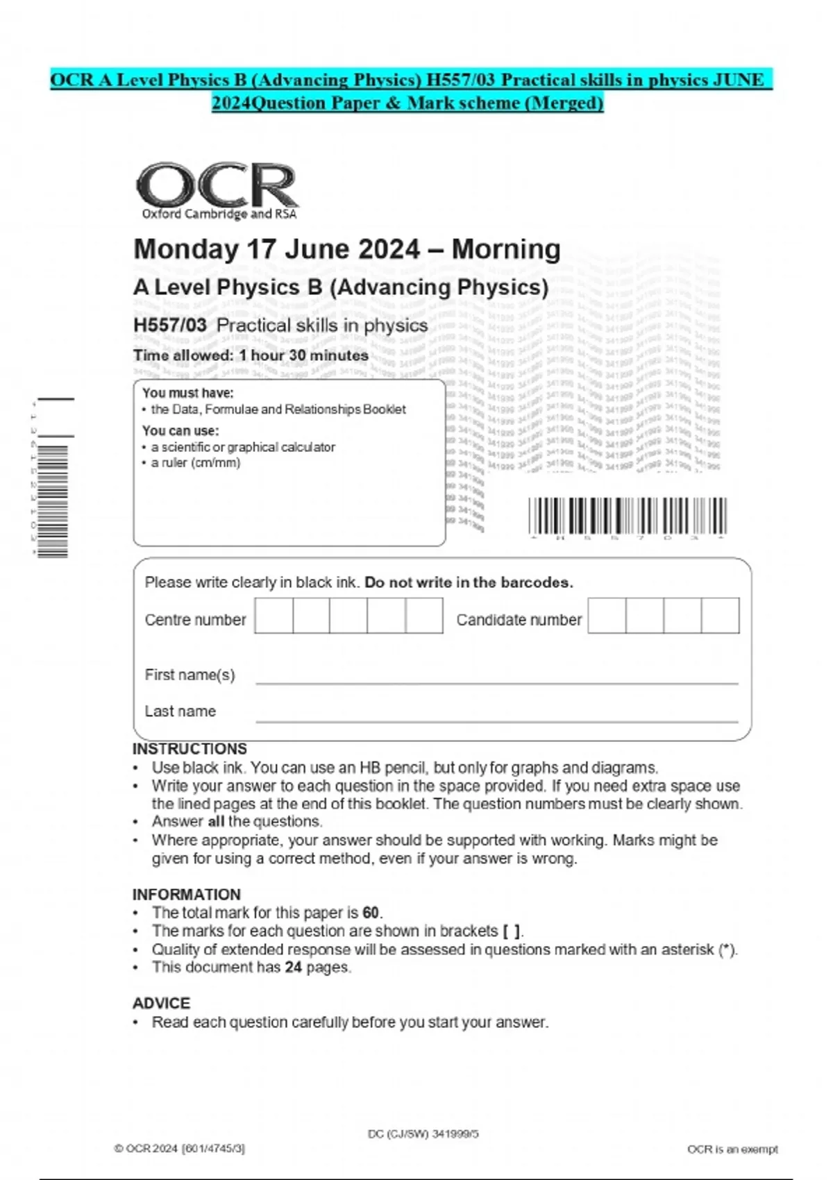 OCR A Level Physics B (Advancing Physics) H557/03 Practical skills in physics JUNE 2024Question Paper & Mark scheme (Merged)