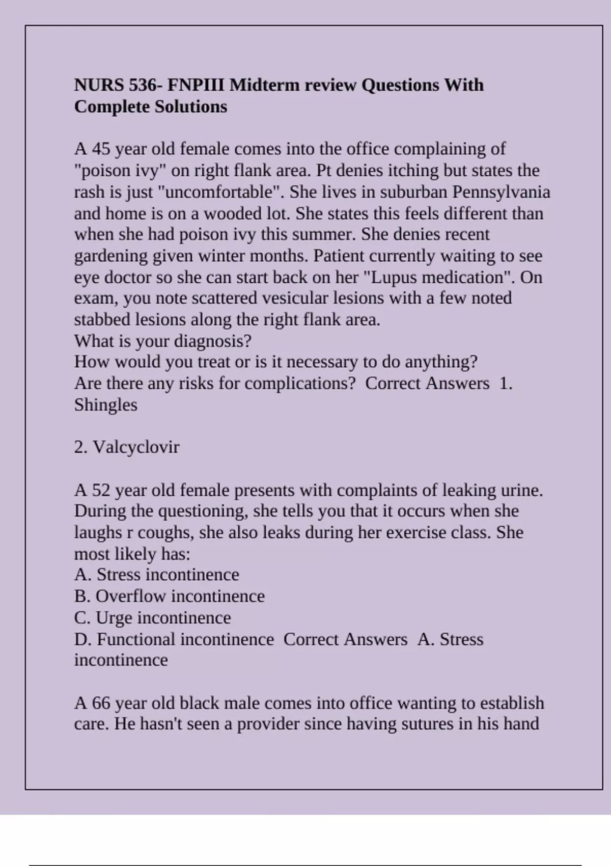 D. Urinary incontinence Correct Answers A. Bladder pain that