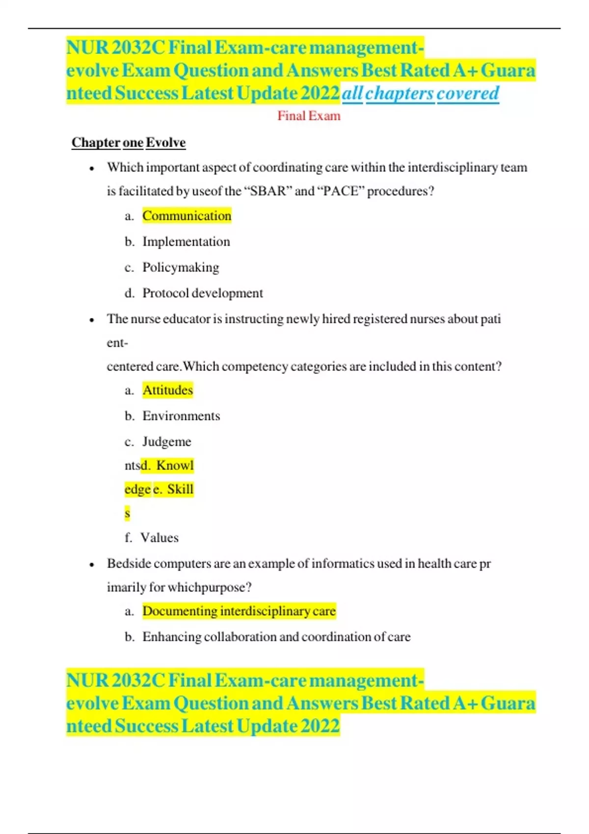 NUR 2032C Final Exam-care management-evolve Exam Question and Answers Best Rated A+ Guaranteed Success Latest Update 2022 all chapters covered