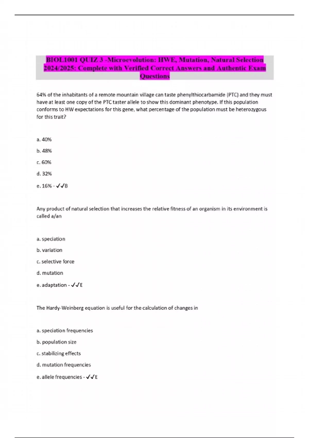 BIOL1001 QUIZ 3 -Microevolution: HWE, Mutation, Natural Selection 2024/2025: Complete with Verified Correct Answers