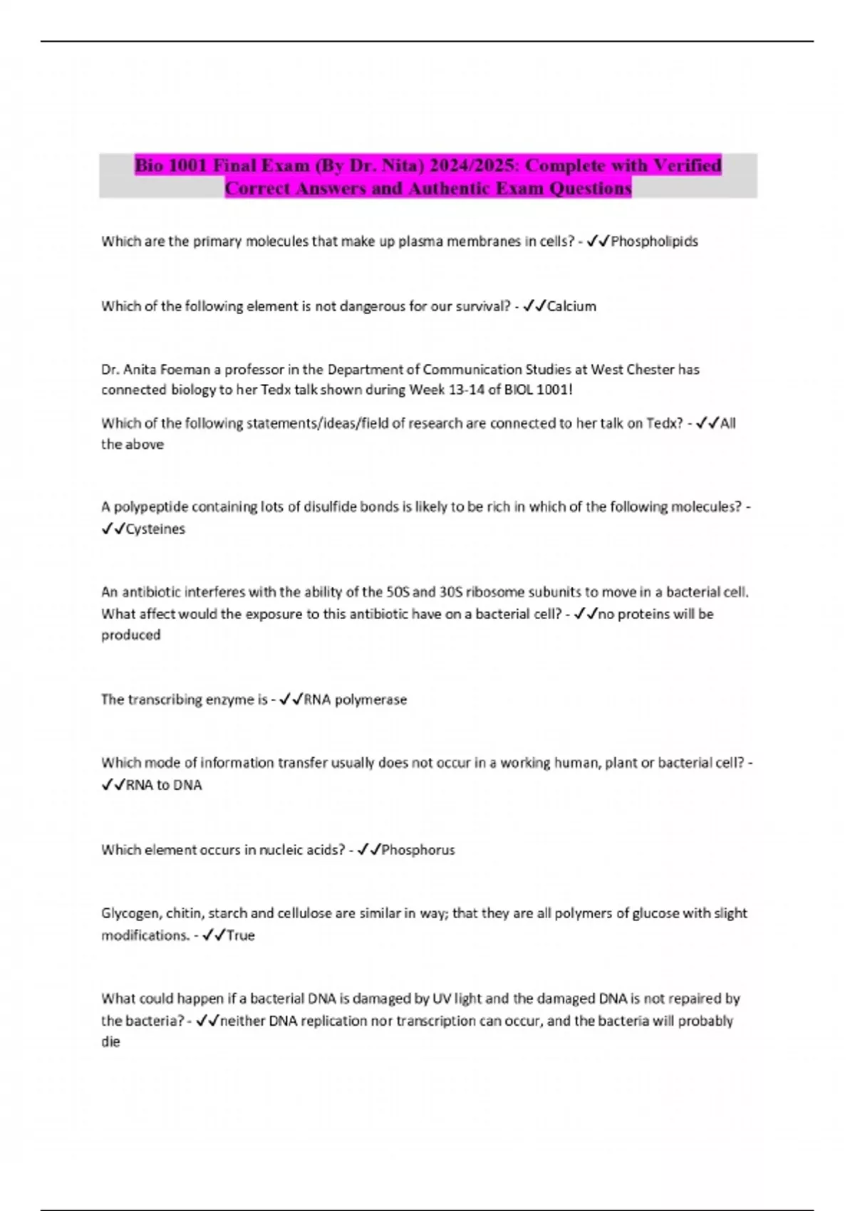 Bio 1001 Final Exam (By Dr. Nita) 2024/2025: Complete with Verified Correct Answers