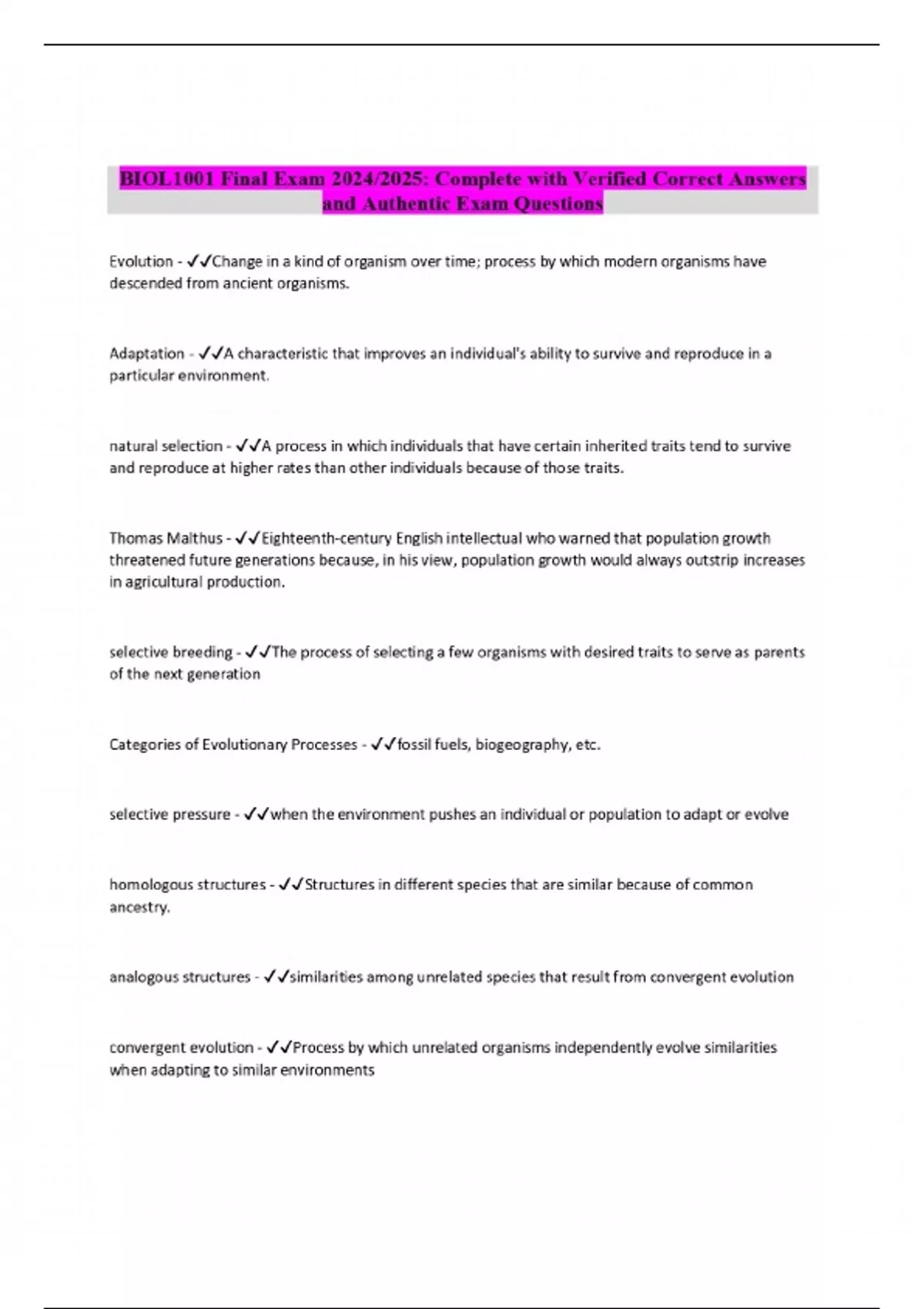BIOL1001 Final Exam 2024/2025: Complete with Verified Correct Answers