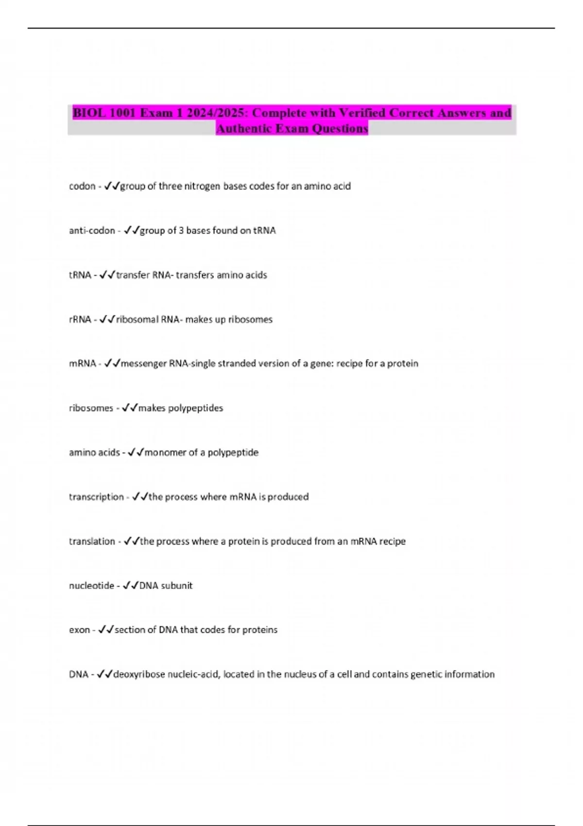 biol 1001 exam complete with verified