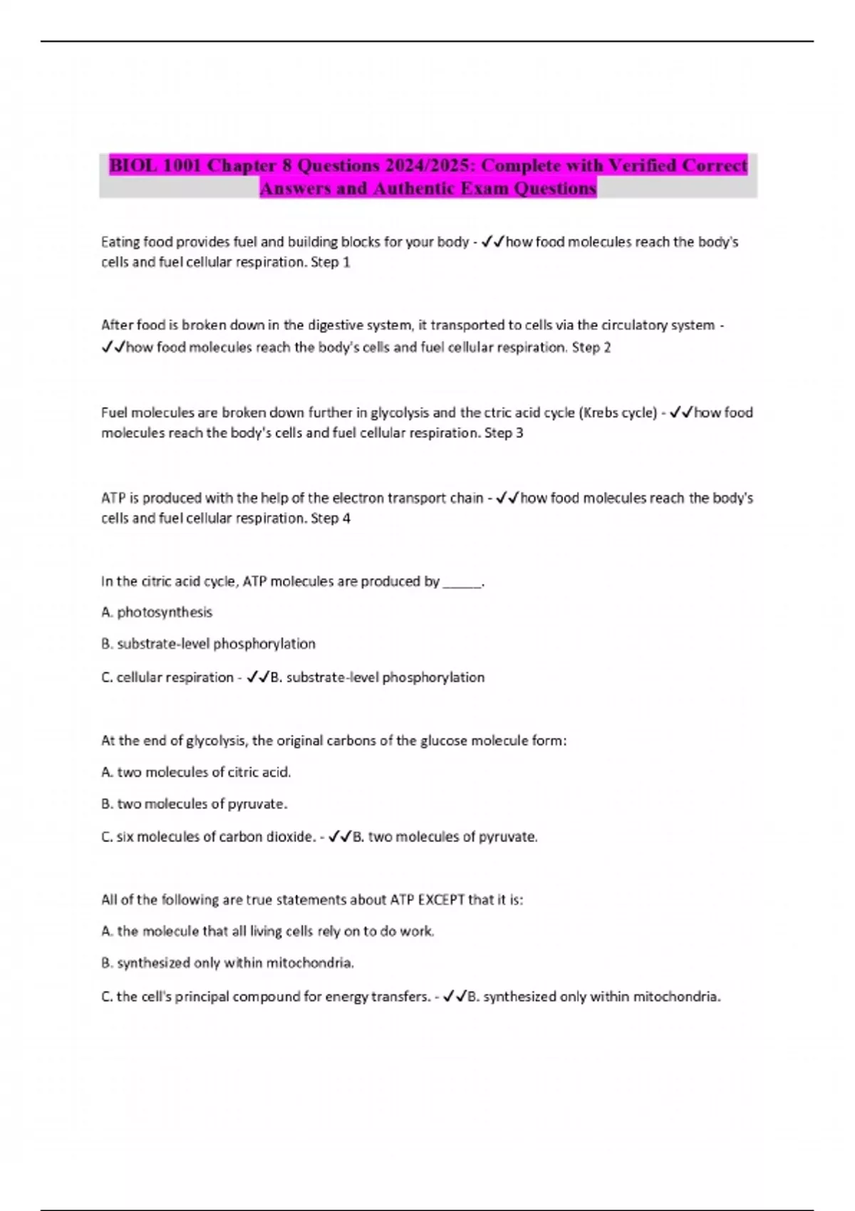 BIOL 1001 Chapter 8 Questions 2024/2025: Complete with Verified Correct Answers