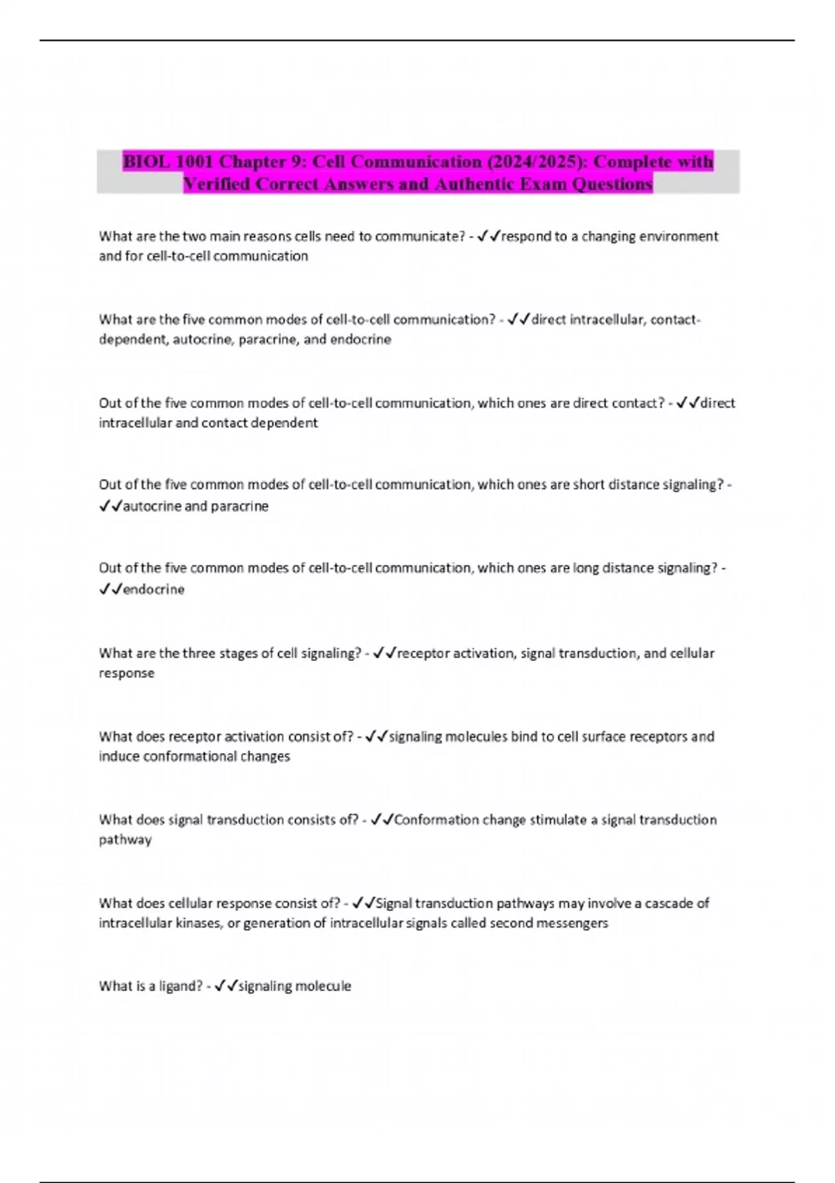 BIOL 1001 Chapter 9: Cell Communication (2024/2025): Complete with Verified Correct Answers