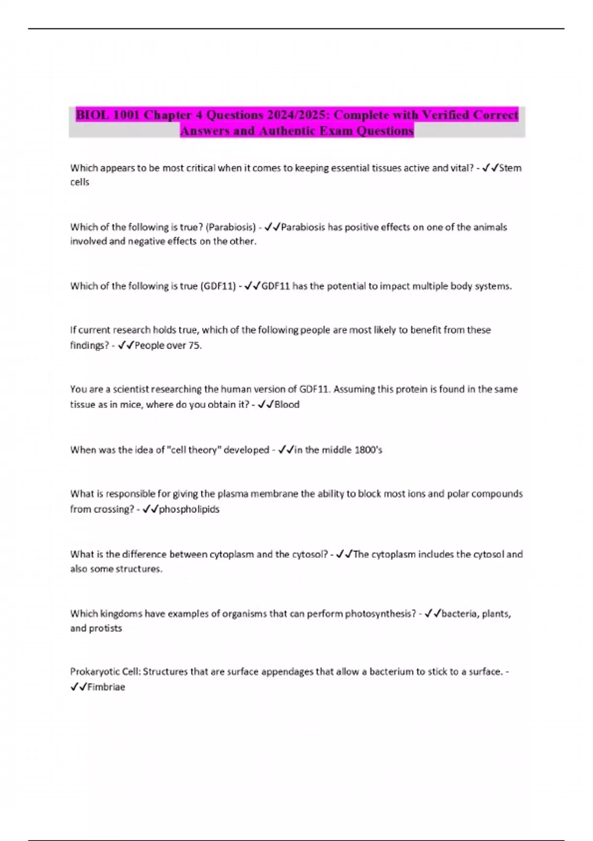 BIOL 1001 Chapter 4 Questions 2024/2025: Complete with Verified Correct Answers
