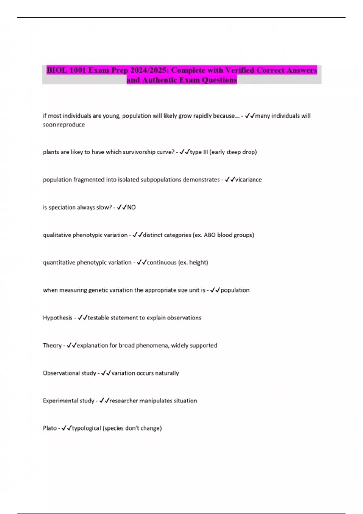 BIOL 1001 Exam Prep 2024/2025: Complete with Verified Correct Answers