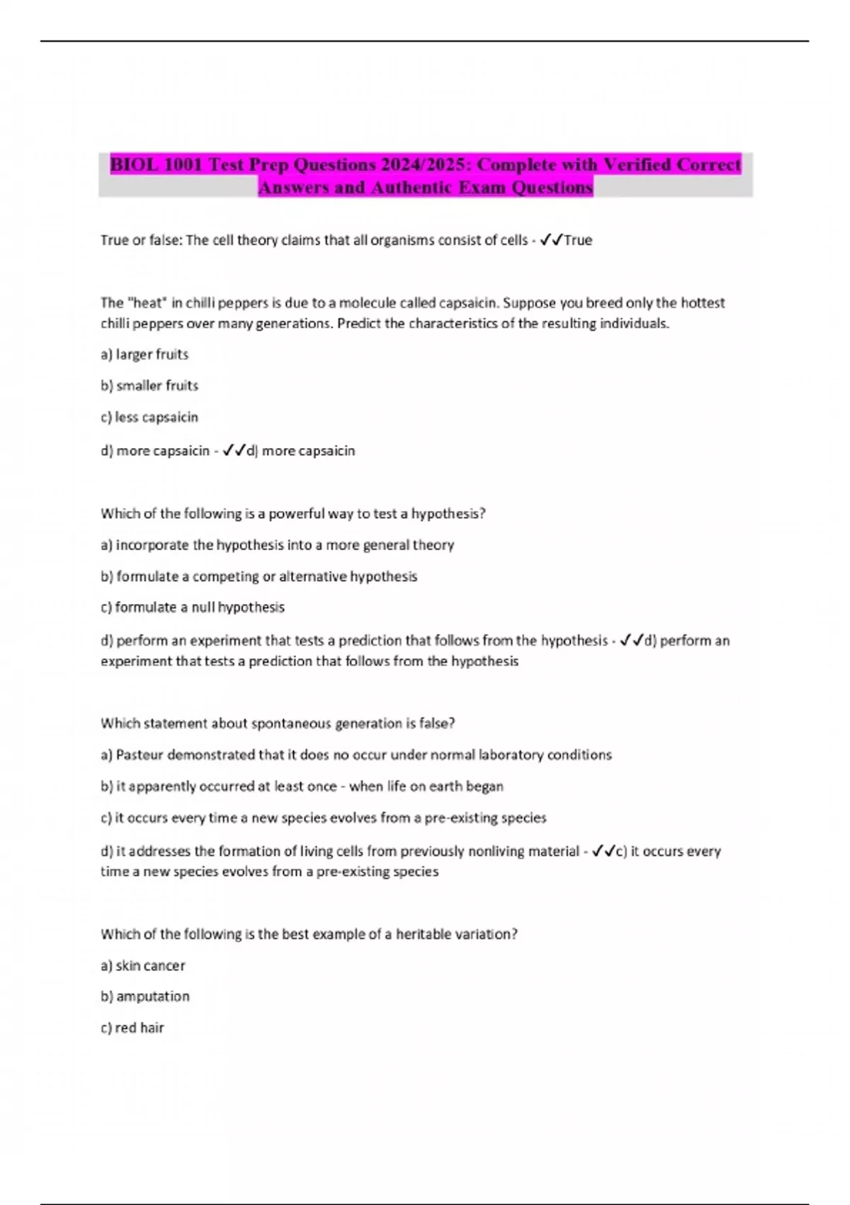 BIOL 1001 Test Prep Questions 2024/2025: Complete with Verified Correct Answers