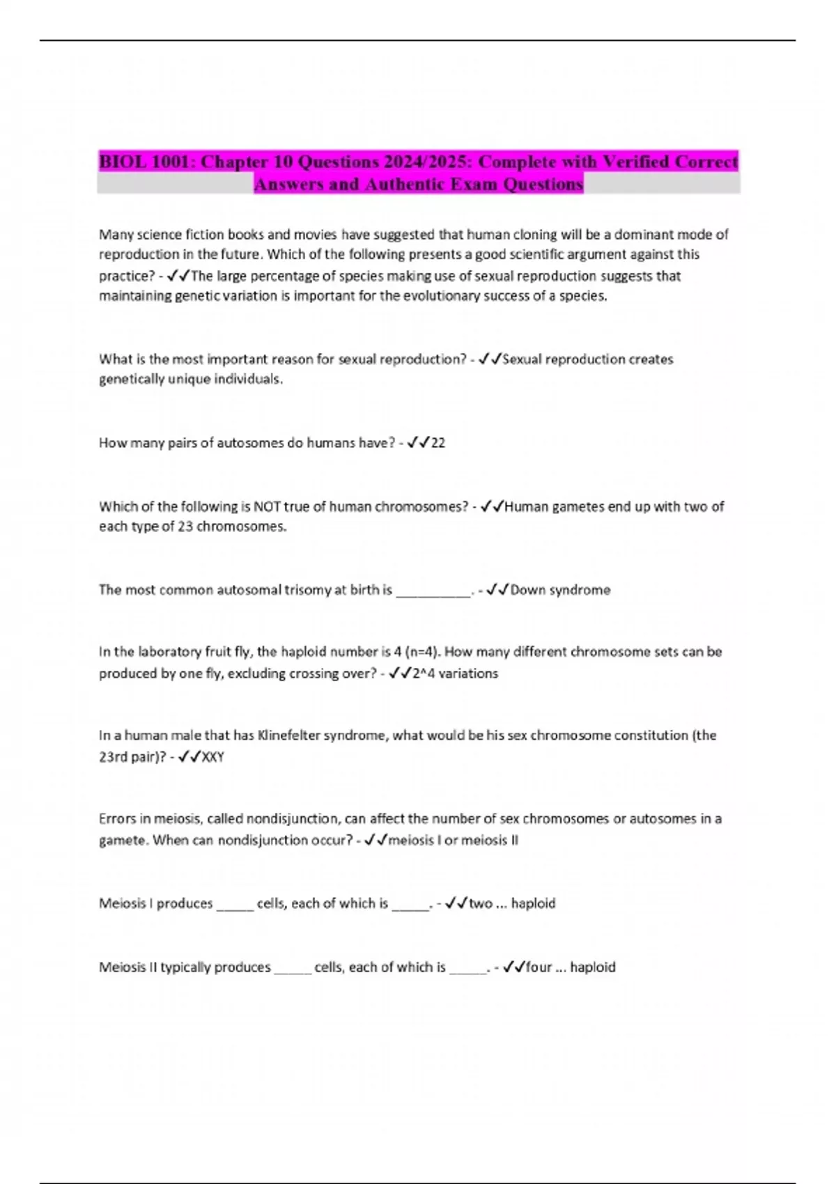 BIOL 1001: Chapter 10 Questions 2024/2025: Complete with Verified Correct Answers