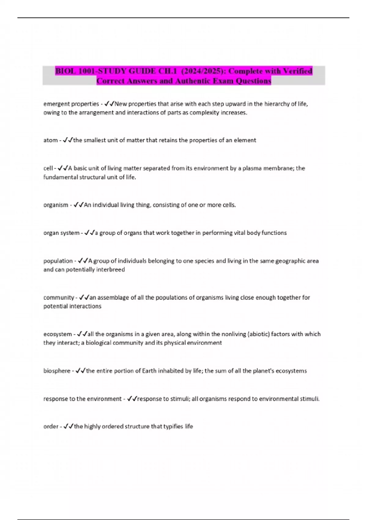 BIOL 1001-STUDY GUIDE CH.1 (2024/2025): Complete with Verified Correct Answers