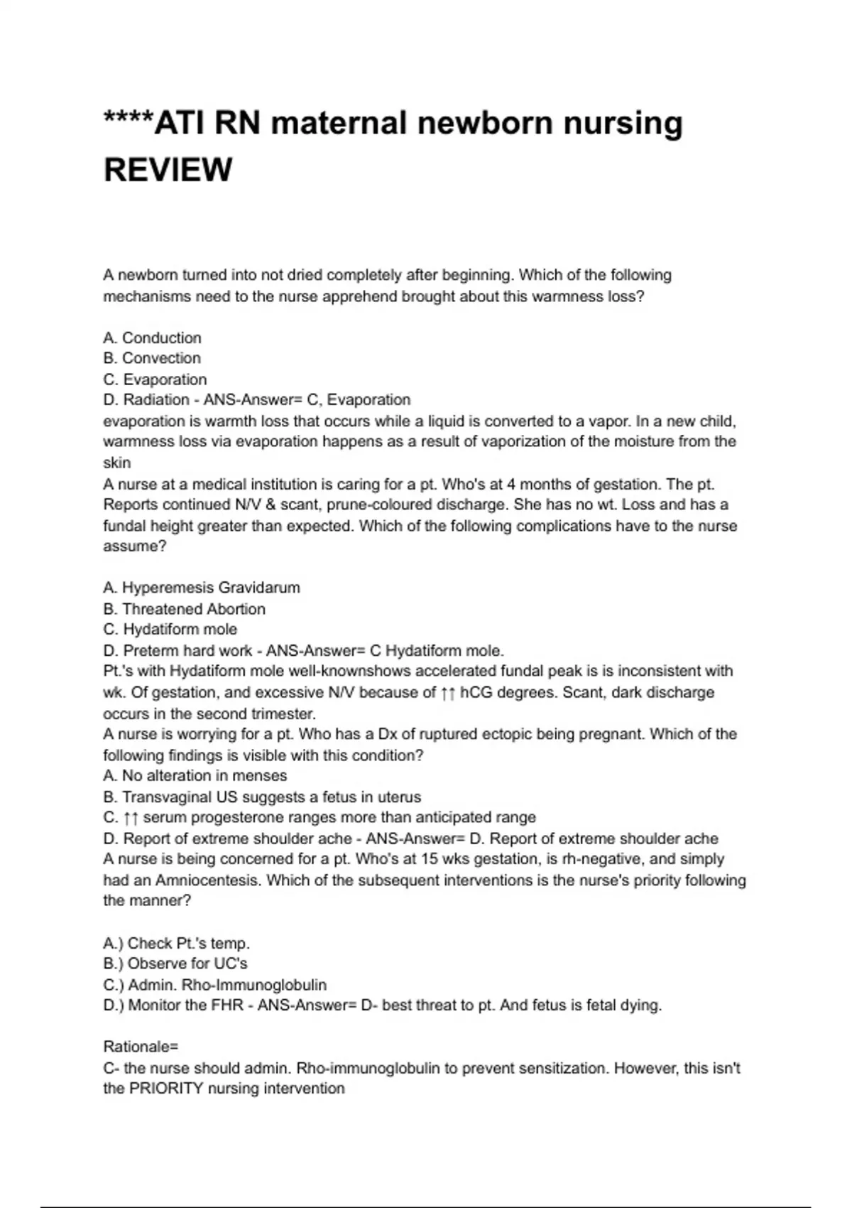 D. Preterm hard work - ANS-Answer= C Hydatiform mole.