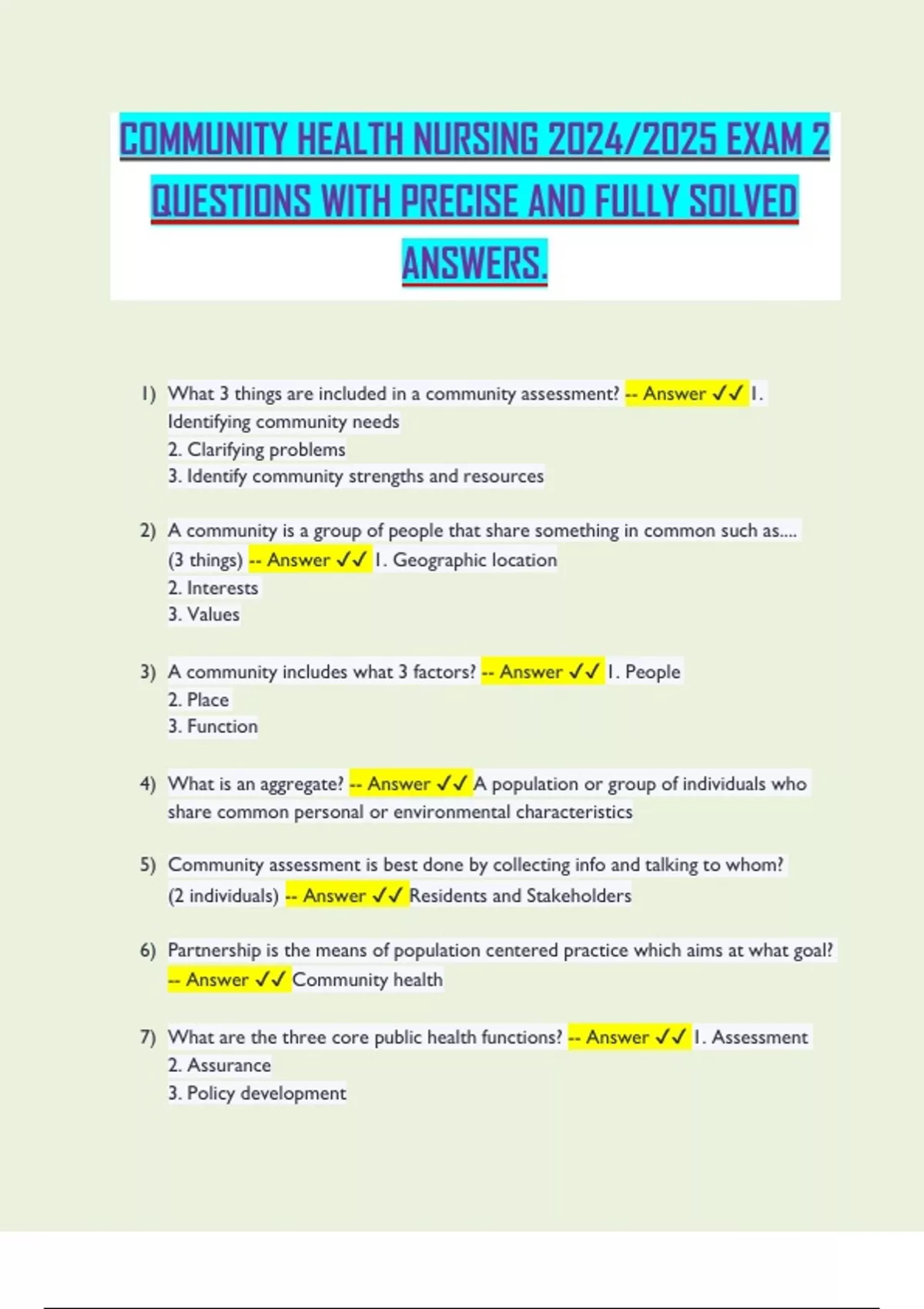 1) What 3 things are included in a community assessment? -- Answer ✔✔ 1.