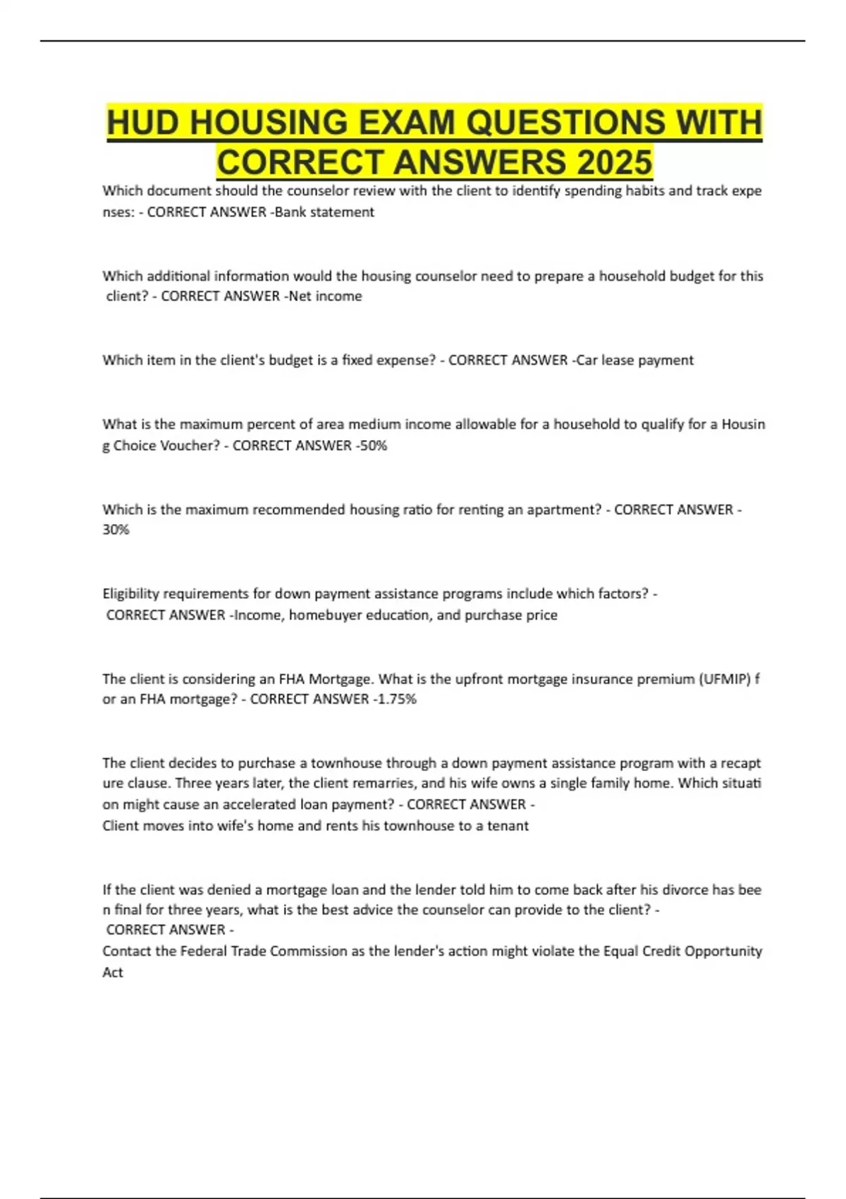 HUD HOUSING EXAM QUESTIONS WITH