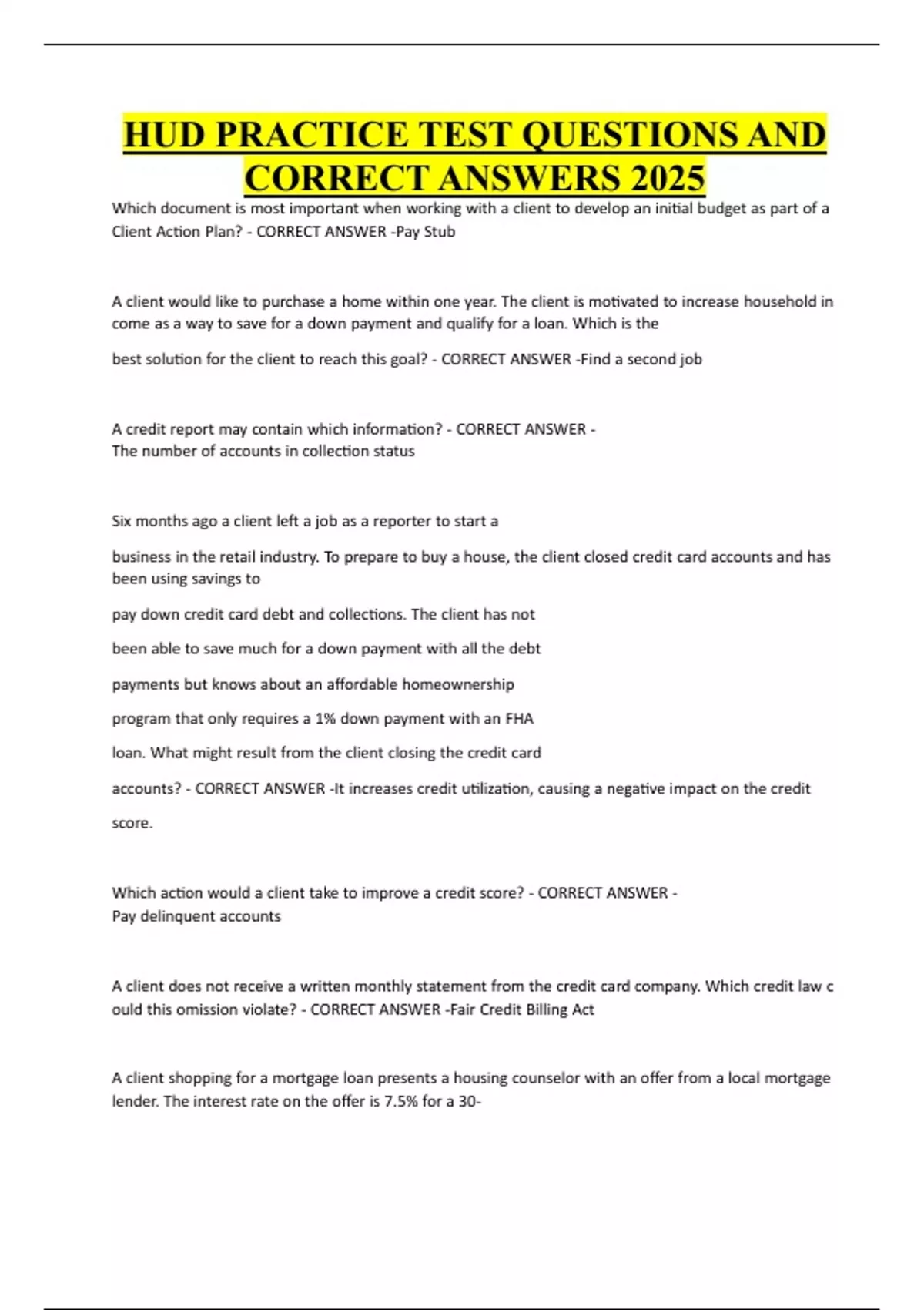 HUD PRACTICE TEST QUESTIONS AND CORRECT ANSWERS 2025