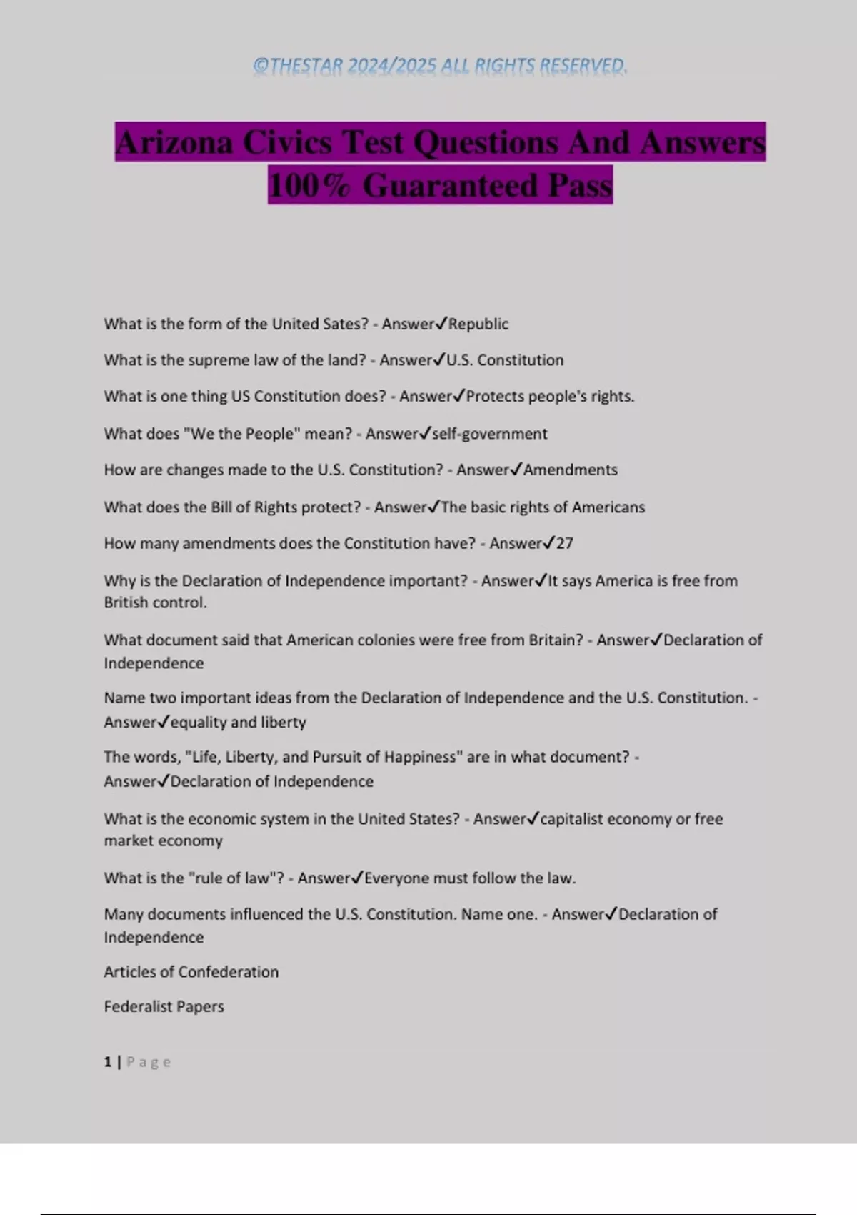 What is the supreme law of the land? - Answer✔U.S. Constitution