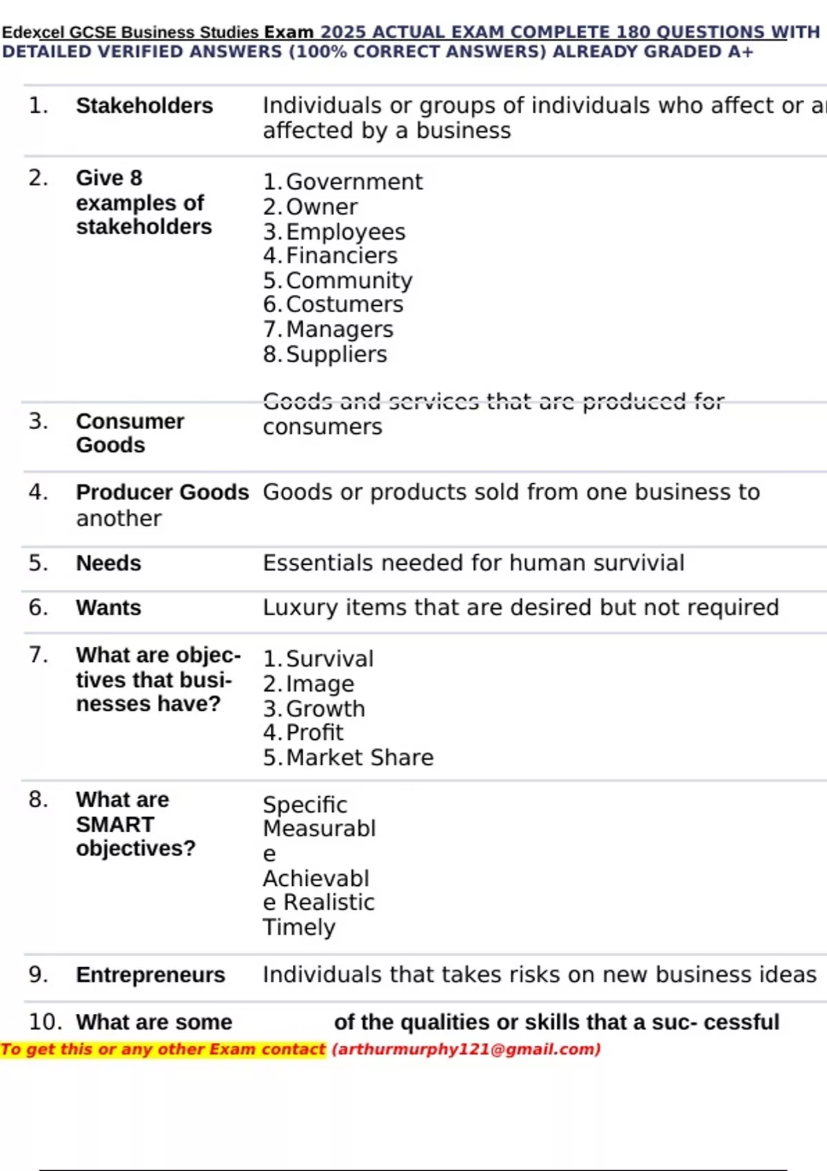 Edexcel GCSE Business Studies Exam 2025 ACTUAL EXAM COMPLETE 180 QUESTIONS WITH