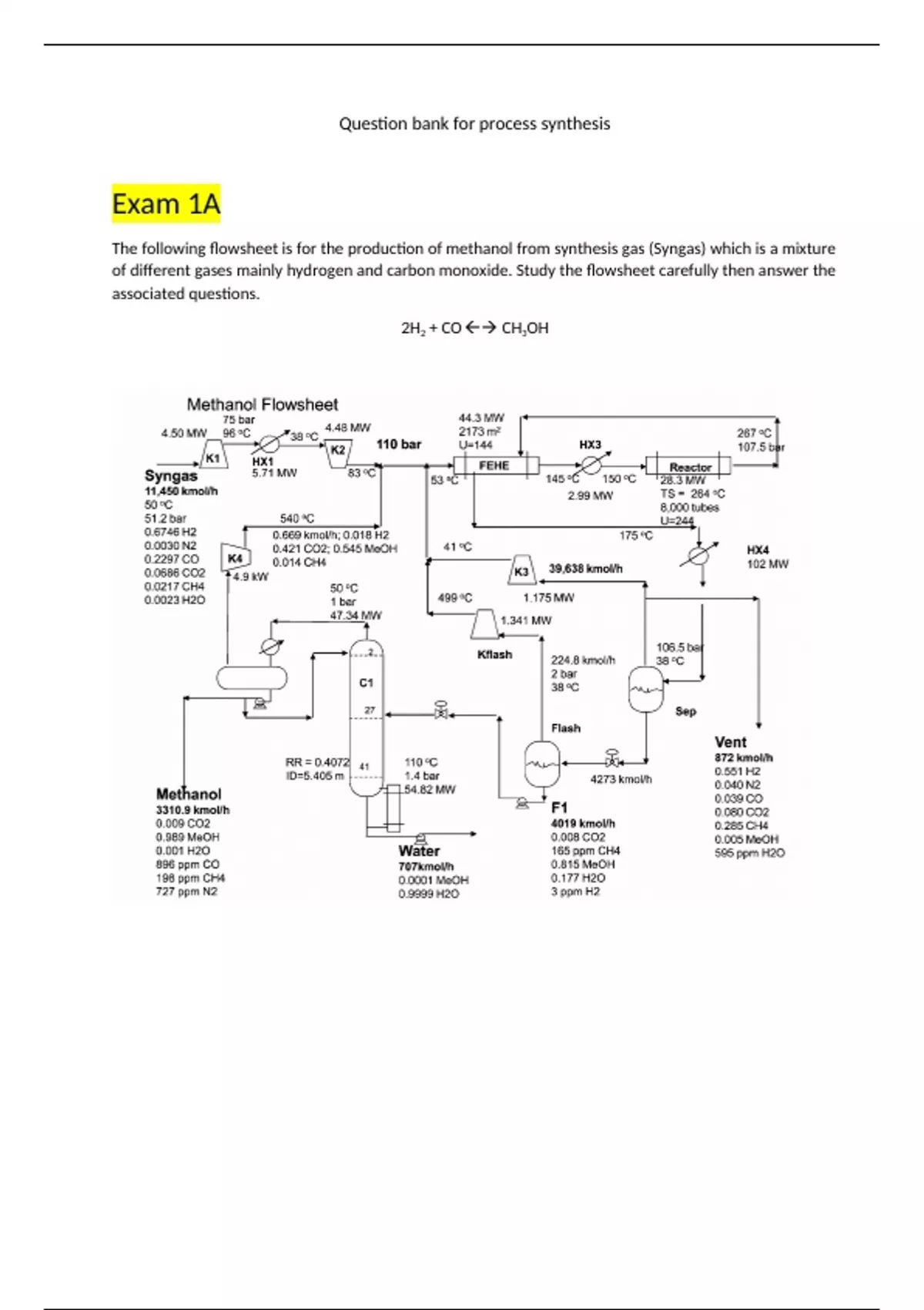 The following flowsheet is for the production of methanol from synthesis gas (Syngas) which is a mixture