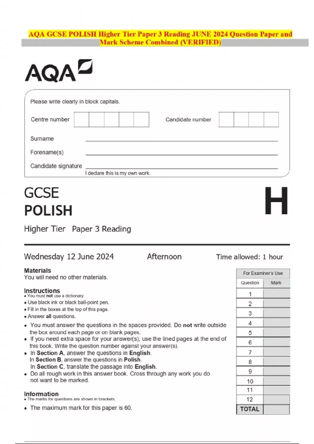 EXAMS BUNDLE::::AQA GCSE POLISH Higher Tier | 2024 Question Papers and Mark Scheme COMBINED (Verified)