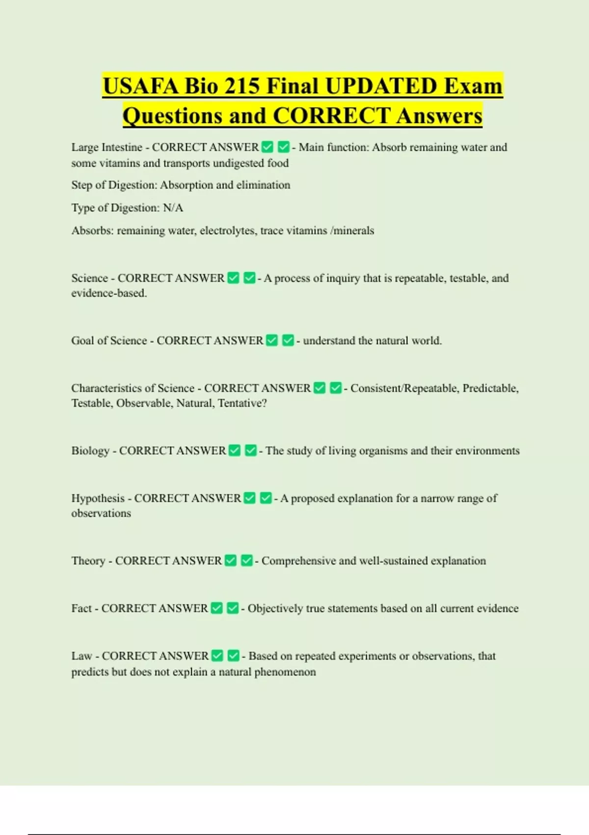 USAFA Bio 215 Final UPDATED Exam Questions and CORRECT Answers Large Intestine - CORRECT ANSWER - Main function: Absorb remaining water and some vitamins and transports undigested food Step of Digestion: Absorption and elimination Type of Digestion: N/A Absorbs: remaining water, electrolytes, trace vitamins /minerals
