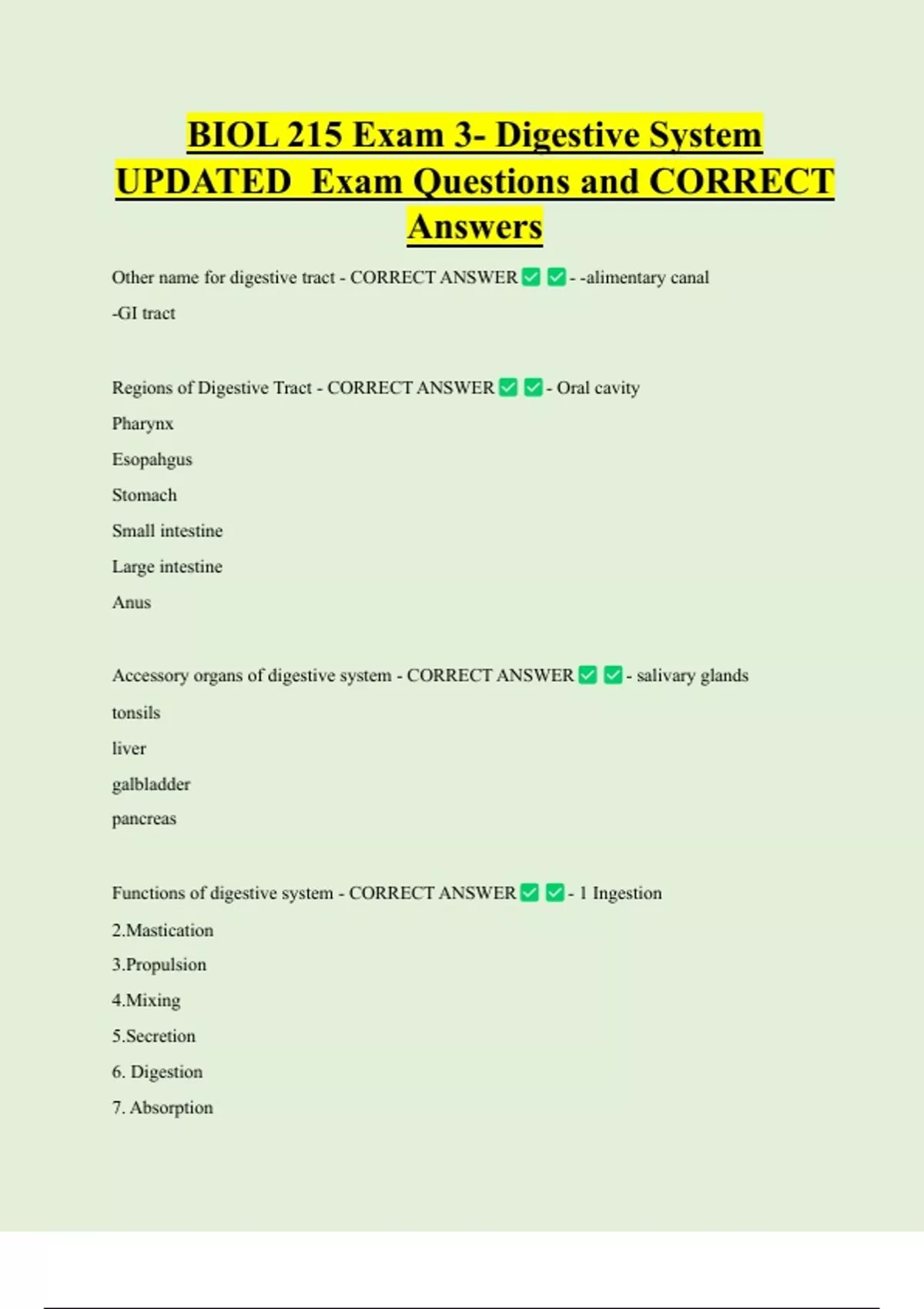 Other name for digestive tract - CORRECT ANSWER - -alimentary canal