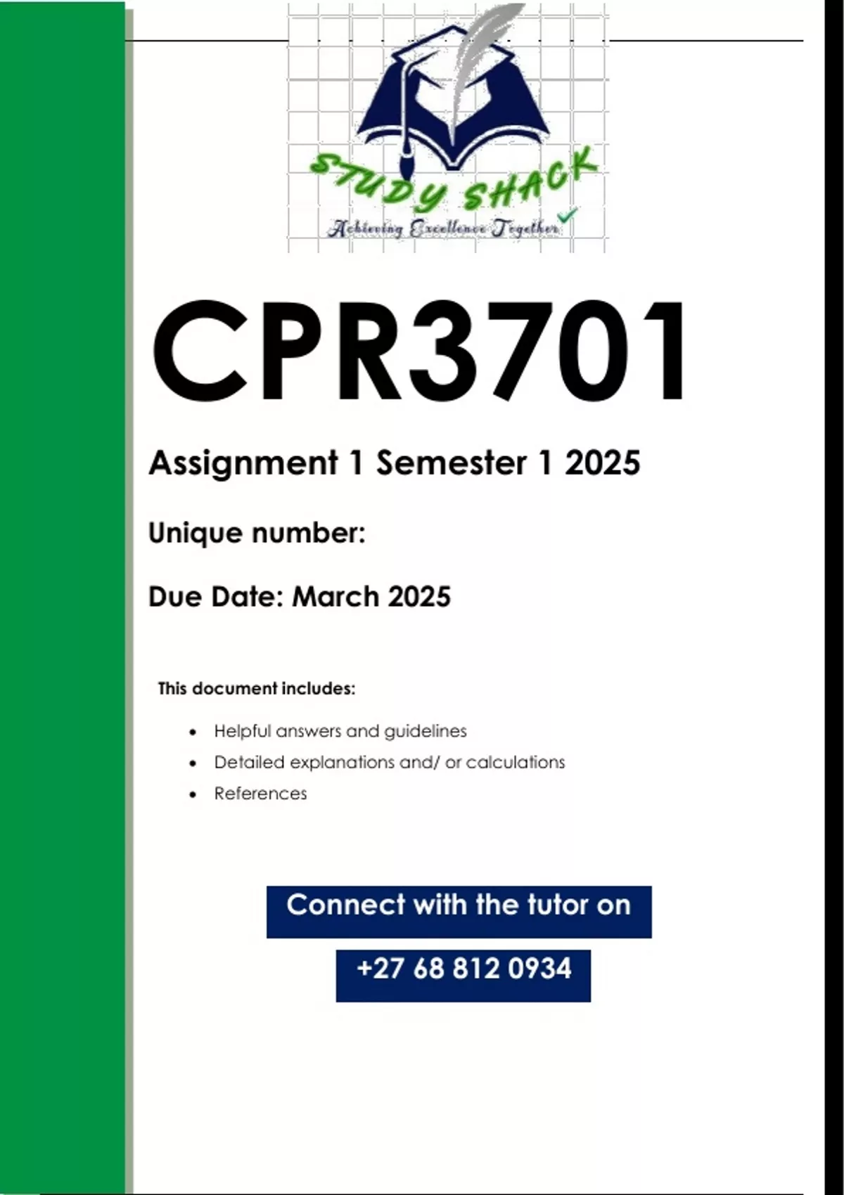 This document contains workings, explanations and solutions to the CPR3701 Assignment 1 (QUALITY ANSWERS) Semester 1 2025. For assistance whats-app us on 0.6.8..8.1.2..0.9.3.4... Four assailants, A, B, C and D are engaged in an armed robbery at Shiny Things, a jewellery store located inside the Mall For All shopping centre in Kimberley, Northern Cape. During the ensuing fracas, a firefight ensues, as the security guards employed by the shopping centre attempt to foil the robbery. A is arrested inside the jewellery store by F, one of the security guards. However, B, C and D manage to escape with an undisclosed amount in fine jewellery and cash. 1. B and C are subsequently arrested two weeks later in Cape Town, Western Cape, in the process of committing another robbery. (a) Briefly state the court(s) (according to the hierarchy of courts, not the location) which should enjoy trial jurisdiction in respect of the charges set out above, and the reason why the case may be heard in the jurisdiction(s) concerned; (3) (b) Critically evaluate which court should enjoy jurisdiction over A, B and C, in light of the facts set out above. (4) 2. In terms of section 35(3)(d) of the Constitution, and section 50 of the Criminal Procedure Act, an arrestee must be brought before court as soon as reasonably possible. B and C (the accused) were arrested on Tuesday at 10h00, and detained at the Cape Town police station, whilst awaiting to be transferred to Kimberley, to be joined with A in respect of the robbery committed in Kimberley. Inspector Nosey Kekana only brings the accused before court on Friday (of the same week), at 15h00. The accused subsequently challenge their detention as unlawful and "falling foul of legislative and Constitutional imperative". Critically evaluate the accused's argument, in light of the facts set out above. (5) 3. After pleading 'not guilty' to the charges. Two state witnesses are led in evidence. The court sets down the case to a different date for further hearing. Briefly explain whether the 'setting down' of the case to a different date as explained above constitutes a postponement or an adjournment (and why you say so). (3) LEV3701 A and B are subsequently arrested a few weeks after the robbery. A, B, C and D apply for bail. The prosecutor, Ms. PP, argues, during the bail proceedings, that the accused will be charged, in the subsequent criminal trial, with robbery with aggravating circumstances. The accused contend, on the other hand, that the State does not have a strong case against them, and that “the interests of justice” justify their release on bail. During the bail application, Ms.PP, is adamant that the accused must not be granted bail. She further contends before court, that (a) CIV3701 the crime of robbery with aggravating circumstances is classified under Schedule 5 of the Criminal Procedure Act; and (1) (b) the prosecution must discharge its onus beyond any reasonable doubt; (2) (c) in terms of section 60(11)(a) the prosecution bears the onus to prove to the court beyond any reasonable doubt that “substantial and compelling” circumstances exist which justify release on bail (2) MRL3701 Discuss the accuracy or otherwise dynamics of the aspects referred to in (a), (b) and