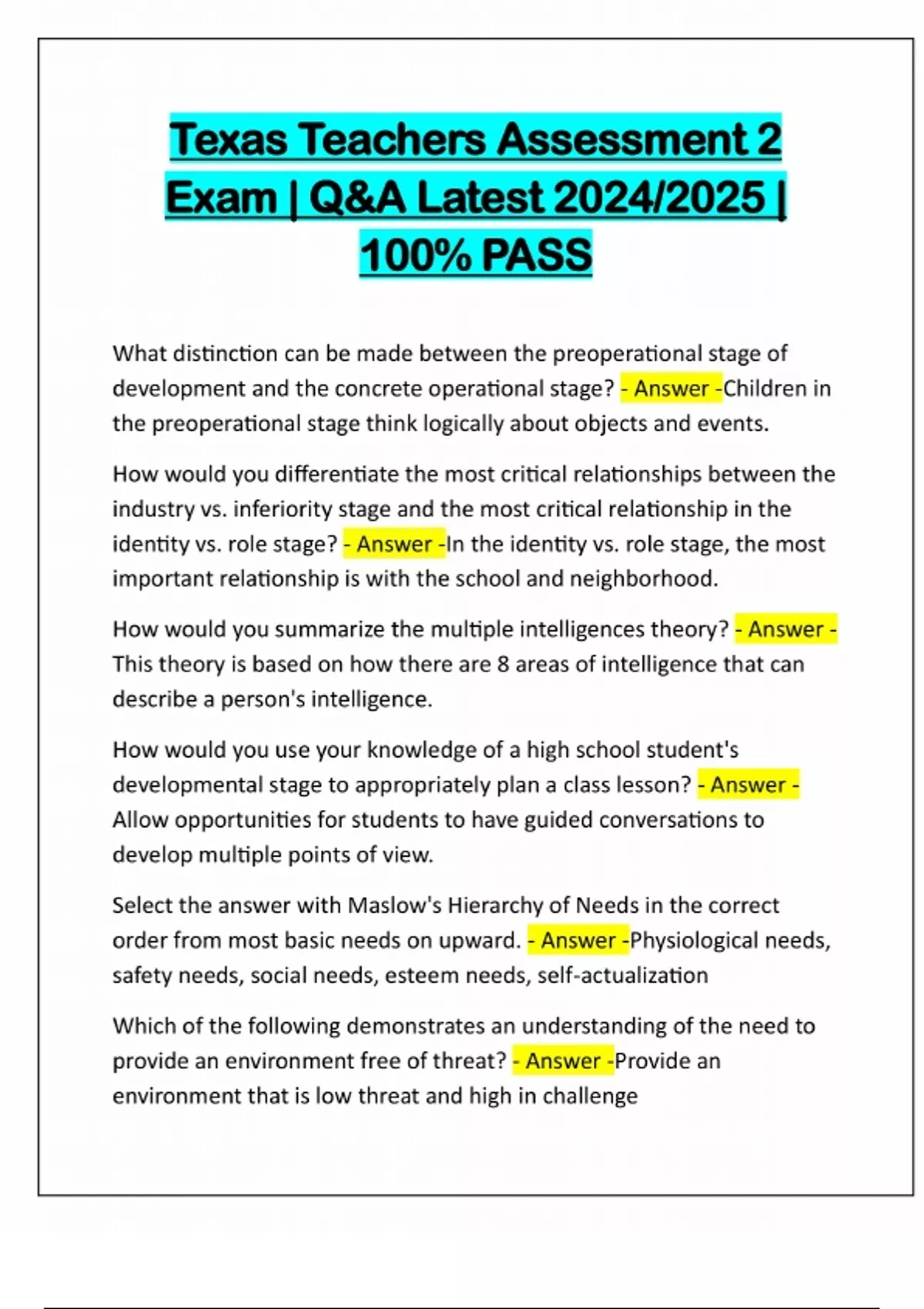 Texas Teachers Assessment 2 Exam | Q&A Latest 2024/2025 | 100% PASS What distinction can be made between the preoperational stage of development and the concrete operational stage? - Answer -Children in the preoperational stage think logically about objects and events. How would you differentiate the most critical relationships between the industry vs. inferiority stage and the most critical relationship in the identity vs. role stage? - Answer -In the identity vs. role stage, the most important relationship is with the school and neighborhood. How would you summarize the multiple intelligences theory? - Answer - This theory is based on how there are 8 areas of intelligence that can describe a person's intelligence. How would you use your knowledge of a high school student's developmental stage to appropriately plan a class lesson? - Answer - Allow opportunities for students to have guided conversations to develop multiple points of view. Select the answer with Maslow's Hierarchy of Needs in the correct order from most basic needs on upward. - Answer -Physiological needs, safety needs, social needs, esteem needs, self-actualization Which of the following demonstrates an understanding of the need to provide an environment free of thr