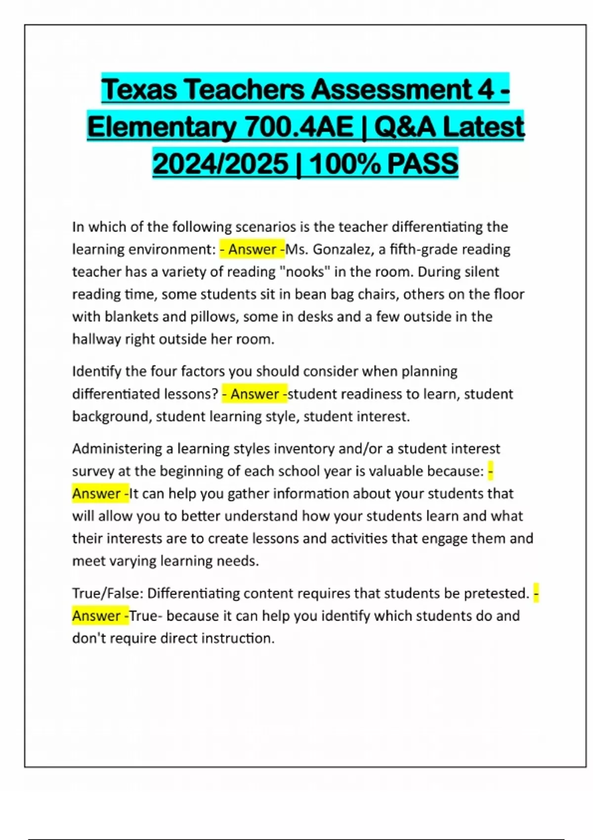 Texas Teachers Assessment 4 - Elementary 700.4AE | Q&A Latest 2024/2025 | 100% PASS In which of the following scenarios is the teacher differentiating the learning environment: - Answer -Ms. Gonzalez, a fifth-grade reading teacher has a variety of reading "nooks" in the room. During silent reading time, some students sit in bean bag chairs, others on the floor with blankets and pillows, some in desks and a few outside in the hallway right outside her room. Identify the four factors you should consider when planning differentiated lessons? - Answer -student readiness to learn, student background, student learning style, student interest. Administering a learning styles inventory and/or a student interest survey at the beginning of each school year is valuable because: - Answer -It can help you gather information about your students that will allow you to better understand how your students learn and what their interests are to create lessons and activities that engage them and meet varying learning needs. True/False: Differentiating content requires that students be preteste