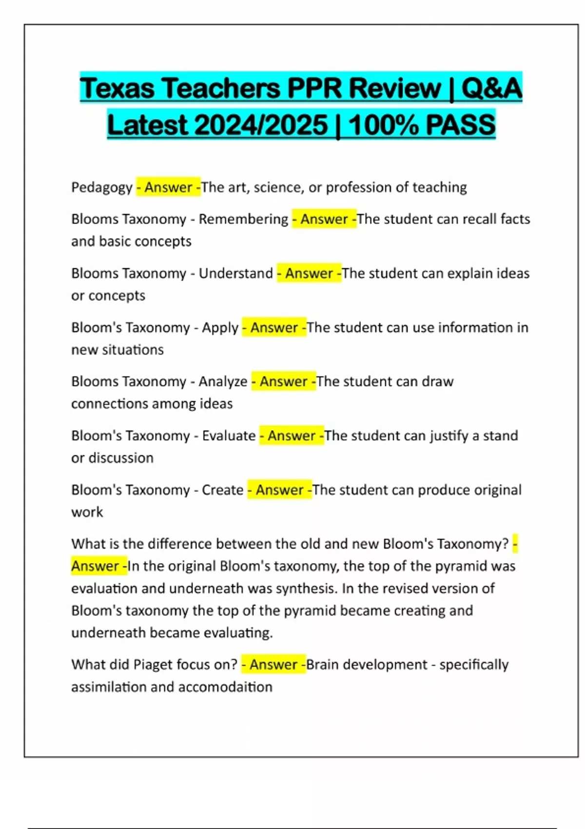 Texas Teachers PPR Review | Q&A Latest 2024/2025 | 100% PASS Pedagogy - Answer -The art, science, or profession of teaching Blooms Taxonomy - Remembering - Answer -The student can recall facts and basic concepts Blooms Taxonomy - Understand - Answer -The student can explain ideas or concepts Bloom's Taxonomy - Apply - Answer -The student can use information in new situations Blooms Taxonomy - Analyze - Answer -The student can draw connections among ideas Bloom's Taxonomy - Evaluate - Answer -The student can justify a stand or discussion Bloom's Taxonomy - Create - Answer -The student can produce original work What is the difference between the old and new Bloom's Taxonomy? - Answer -In the original Bloom's taxonomy, the top of the pyramid was evaluation and underneath was synthesis. In the revised version of Bloom's taxonomy the top of the pyramid became creating and underneath became evaluating.