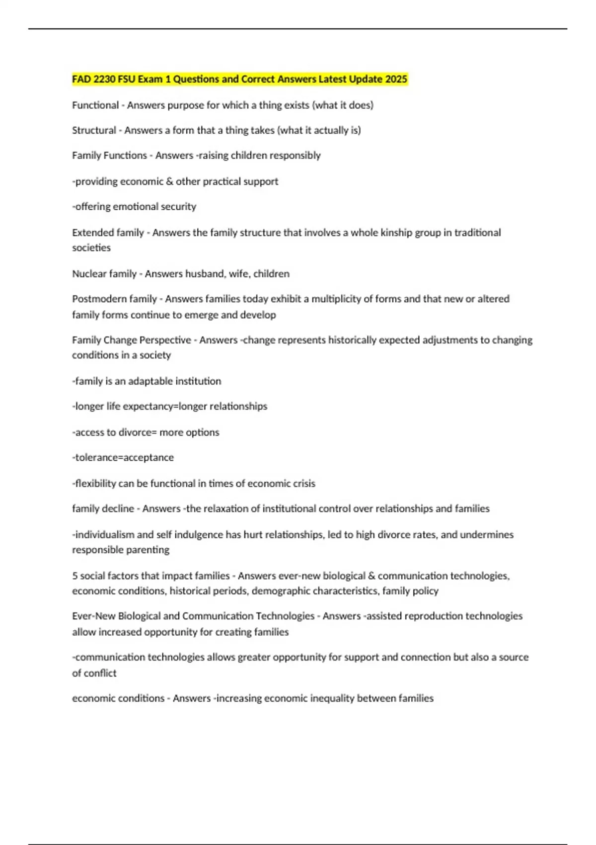 FAD 2230 FSU Exam 1 Questions and Correct Answers Latest Update 2025 Functional - Answers purpose for which a thing exists (what it does) Structural - Answers a form that a thing takes (what it actually is) Family Functions - Answers -raising children responsibly -providing economic & other practical support -offering emotional security Extended family - Answers the family structure that involves a whole kinship group in traditional societies Nuclear family - Answers husband, wife, children Postmodern family - Answers families today exhibit a multiplicity of forms and that new or altered family forms continue to emerge and develop Family Change Perspective - Answers -change represents historically expected adjustments to changing conditions in a society -family is an adaptable institution -longer life expectancy=longer relationships -access to divorce= more options -tolerance=acceptance -flexibility can be functional in times of economic crisis family decline - Answers -the relaxation of institutional control over relationships and families -individualism and self indulgence has hurt relationships, led to high divorce rates, and undermines responsible parenting 5 social factors that impact families - Answers ever-new biological & communication technologies, economic conditions, historical periods, demographic characteristics, family policy Ever-New Biological and Communication Technologies - Answers -assisted reproduction technologies allow increased opportunity for creating families -communication technologies allows greater opportunity for support and connection but also a source of conflict economic conditions - Answers -increasing economic inequality between families -the overall long term trend in US households income has been upward historical periods - Answers -world events impact family values, attitudes, and arrangements ex. great depression, WWII, terrorist threats of the 200s demographic characteristics - Answers -age: people live longer= more years to invest in education & a longer period for family interactions but also a growing populations that must be cared for -religion: religious affiliation and practice is a significant influence on family life= a sense of community, support, and values -race: how people view varied social groups -ethnicity: cultural distinctions, minority group: persons in non white race/ethnic categories who experience disadvantage, exclusion, or discrimination, the US is becoming more racially and ethnically diverse, habitus: ones experience and perception of the social world family policy - Answers -all the procedures, regulations, attitudes and goals of programs and agencies that affect families -family impact lens: a perspective that advocates for thinking about public policies in terms of how they affect whole family units Sliding vs. deciding - Answers -recognize as many options or alternatives as possible -recognize the social pressures that may influence personal choice -consider the consequences of the alternatives rather than gravitating to the one that sounds the most attractive blinders of personal experience - Answers -central aim of scientific investigation is to find out what is exactly going on -science: a logical system that bases knowledge on systematic observation and on empirical evidence (facts that we can verify with our senses) family ecology perspective - Answers explores interactions between varying levels of the external environment and the family ex. work schedules impact on a family family life course development framework - Answers -family is the unit of analysis -role sequencing: order in which major life course transition takes place -normative order hypothesis: work marriage parenthood sequence is best for mental health & happiness -delayed exists: children have not left the home in a timely fashion -stages of the family life course developmental framework; theres just a de