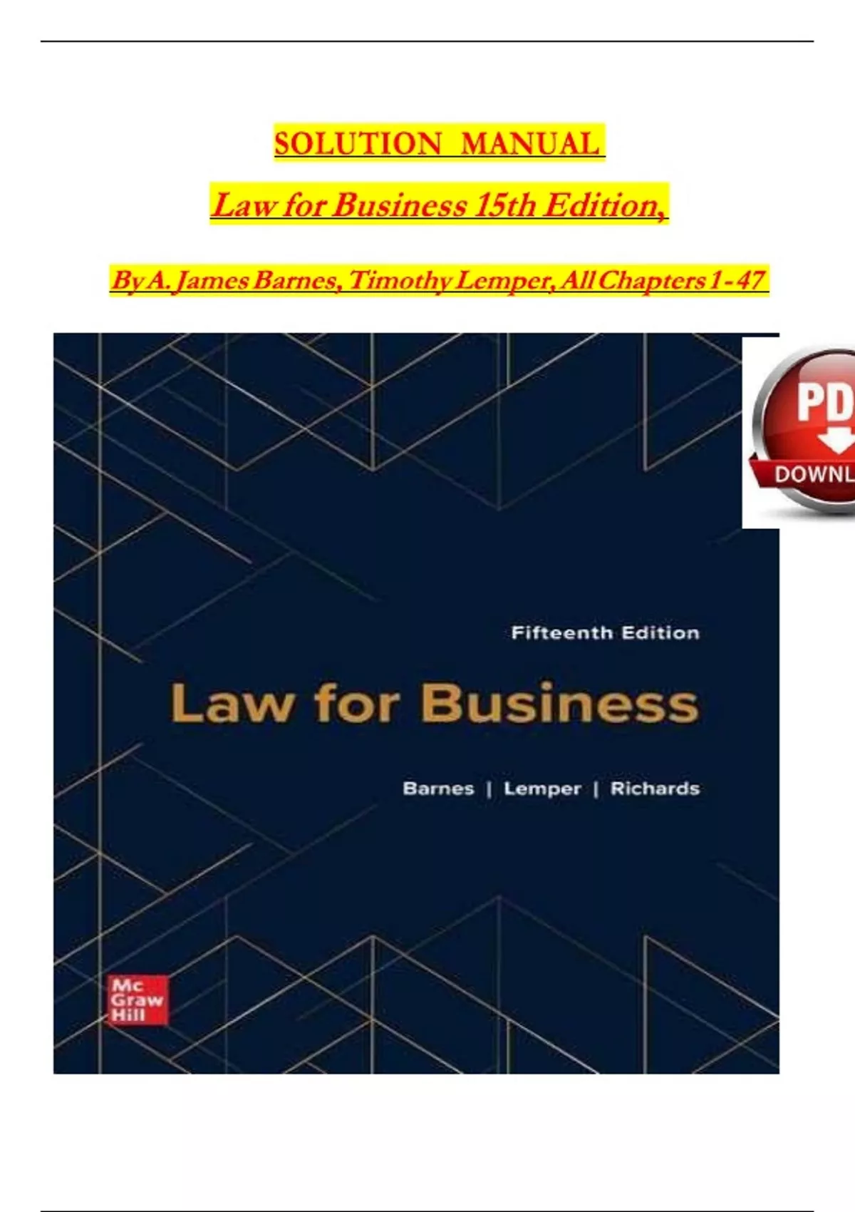 Law for Business, 15th Edition SOLUTION MANUAL By A. James Barnes, Timothy Lemper, Verified Chapters 1 - 47, Complete Newest Version
