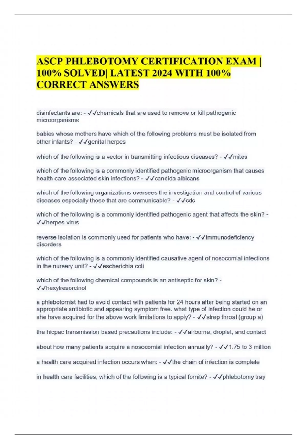 ASCP PHLEBOTOMY CERTIFICATION EXAM | 100% SOLVED| LATEST 2024 WITH 100% CORRECT ANSWERS