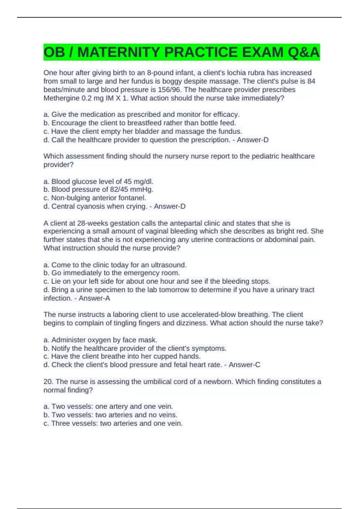 21. A client who gave birth to a healthy 8 pound infant 3 hours ago is admitted to the