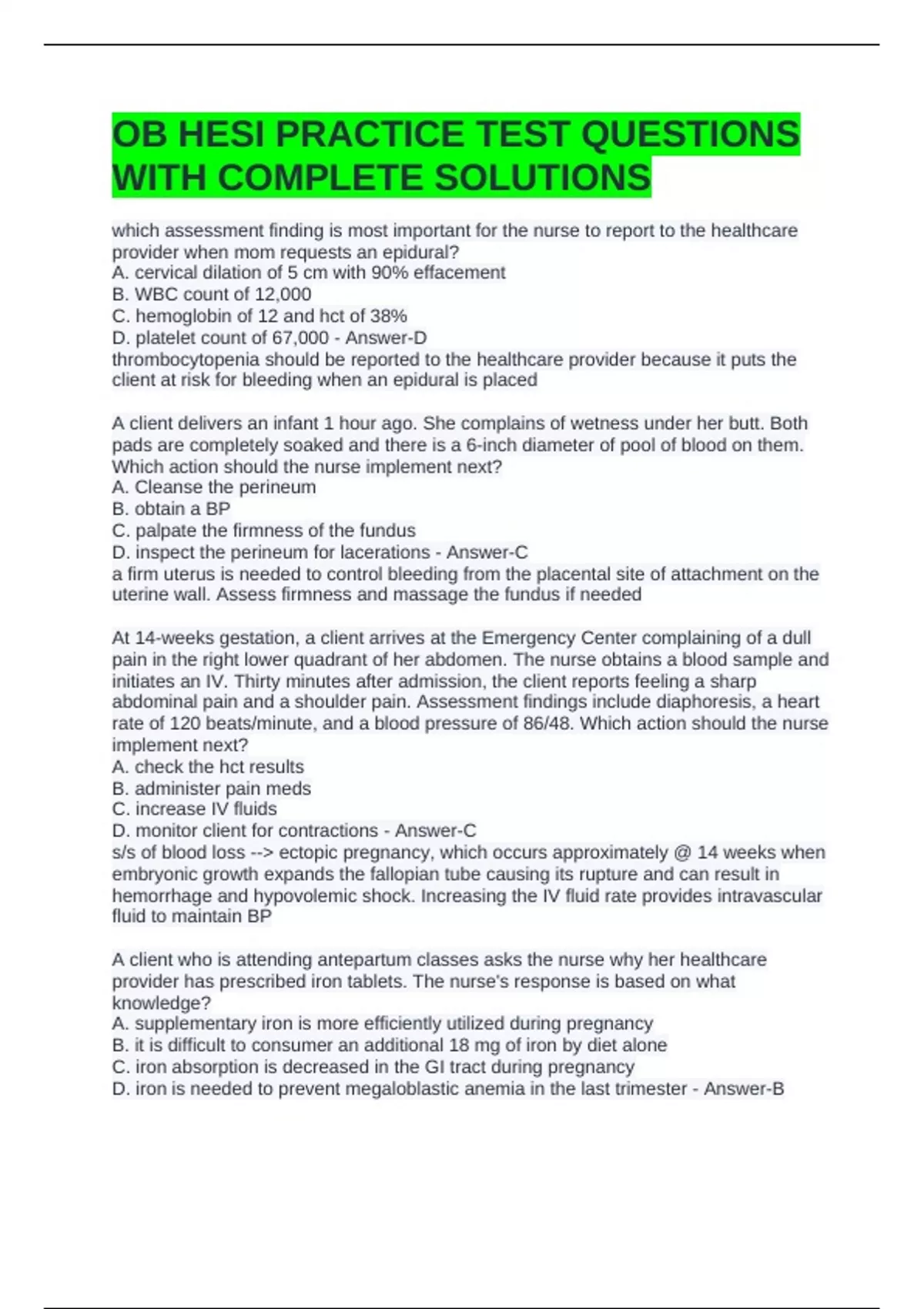 OB HESI PRACTICE TEST QUESTIONS WITH COMPLETE SOLUTIONS