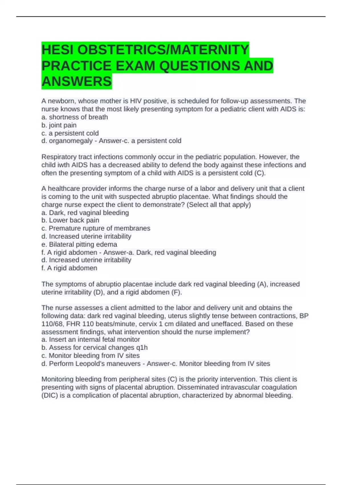 HESI OBSTETRICS/MATERNITY PRACTICE EXAM QUESTIONS AND ANSWERS