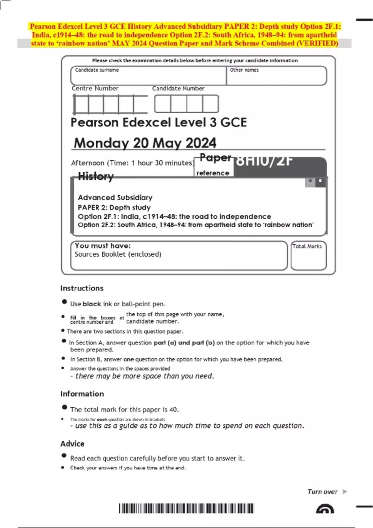 Pearson Edexcel Level 3 GCE History Advanced Subsidiary PAPER 2: Depth study Option 2F.1: India, c1914–48: the road to independence Option 2F.2: South Africa, 1948–94: from apartheid state to ‘rainbow nation’ MAY 2024 Question Paper and Mark Scheme Combined (VERIFIED)