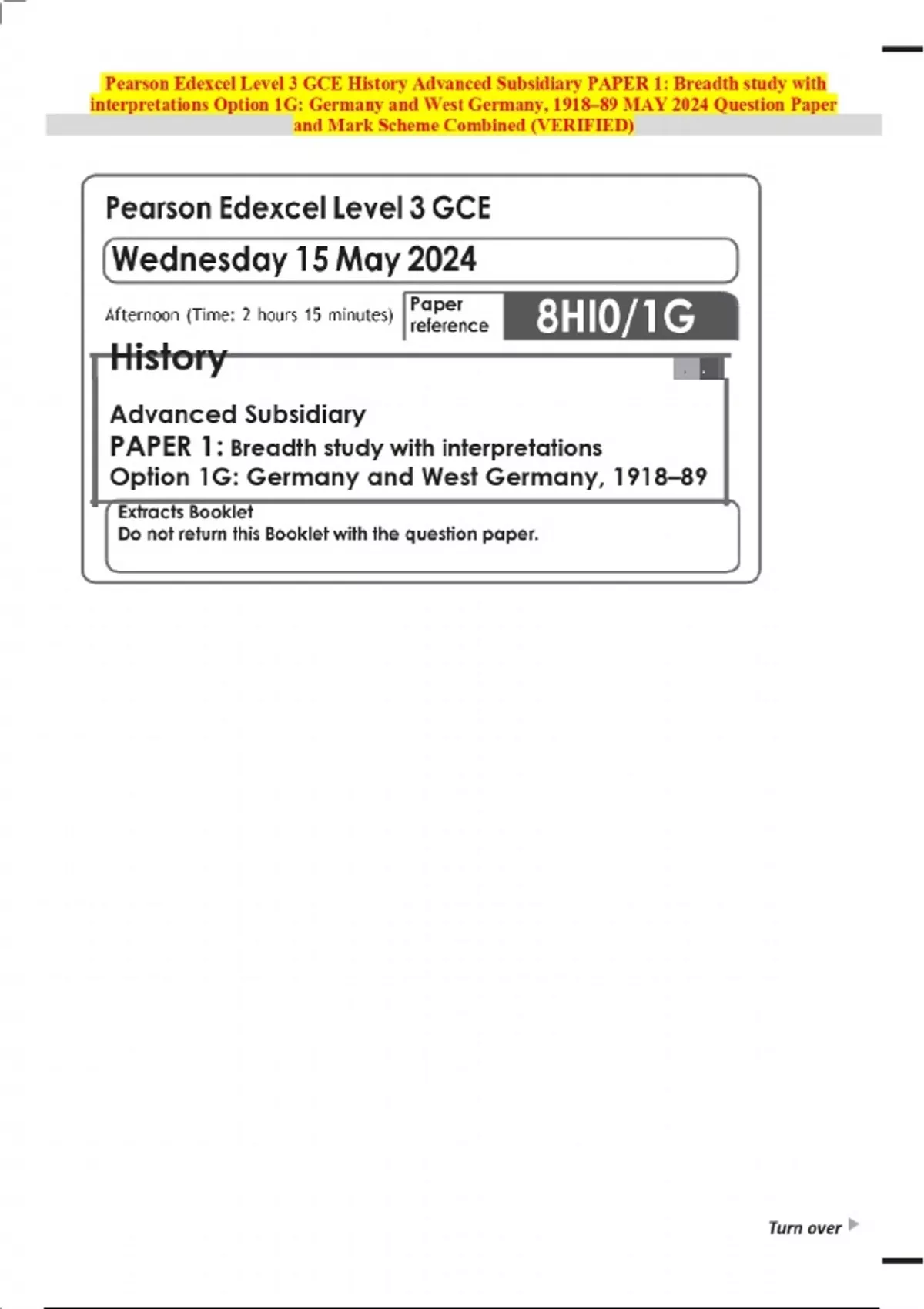 Pearson Edexcel Level 3 GCE History Advanced Subsidiary PAPER 1: Breadth study with interpretations Option 1G: Germany and West Germany, 1918–89 MAY 2024 Question Paper and Mark Scheme Combined (VERIFIED)