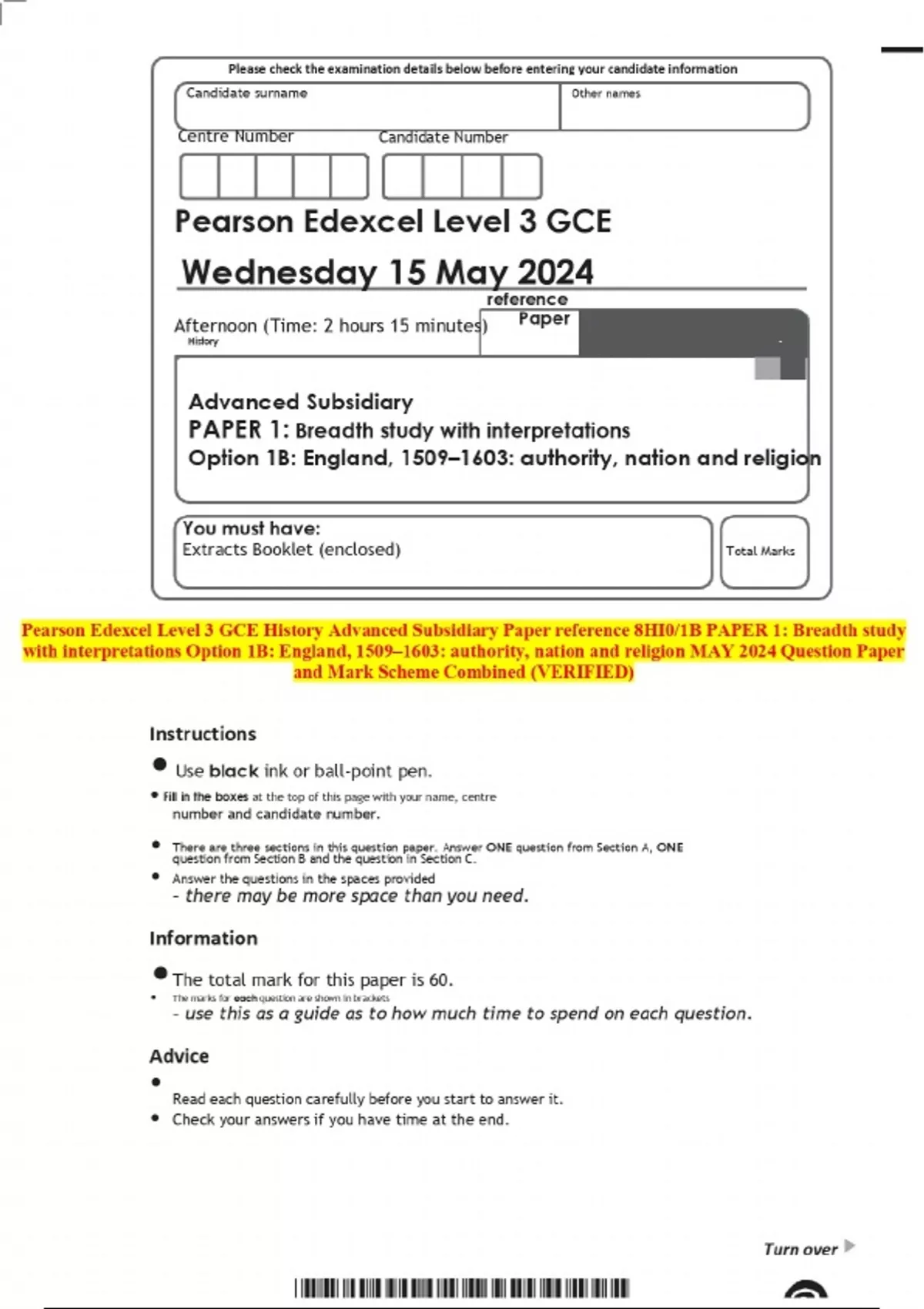 Pearson Edexcel Level 3 GCE History Advanced Subsidiary Paper reference 8HI0/1B PAPER 1: Breadth study with interpretations Option 1B: England, 1509–1603: authority, nation and religion MAY 2024 Question Paper and Mark Scheme Combined (VERIFIED)