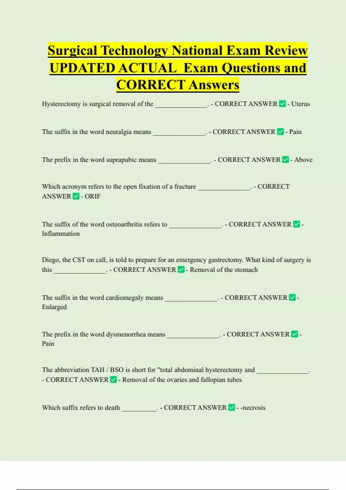 Surgical Technology National Exam Review UPDATED ACTUAL Exam Questions and CORRECT Answers Hysterectomy is surgical removal of the _______________. - CORRECT ANSWER - Uterus The suffix in the word neuralgia means _______________. - CORRECT ANSWER - Pain The prefix in the word suprapubic means _______________. - CORRECT ANSWER - Above