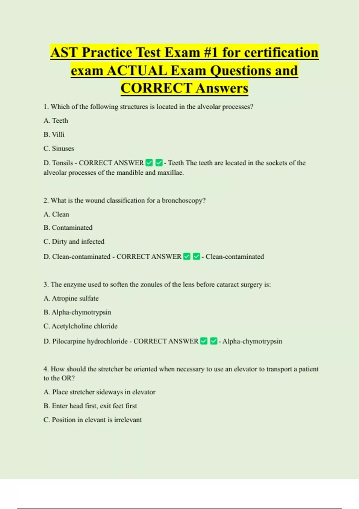 AST Practice Test Exam #1 for certification exam ACTUAL Exam Questions and CORRECT Answers 1. Which of the following structures is located in the alveolar processes? A. Teeth B. Villi C. Sinuses D. Tonsils - CORRECT ANSWER - Teeth The teeth are located in the sockets of the alveolar processes of the mandible and maxillae.