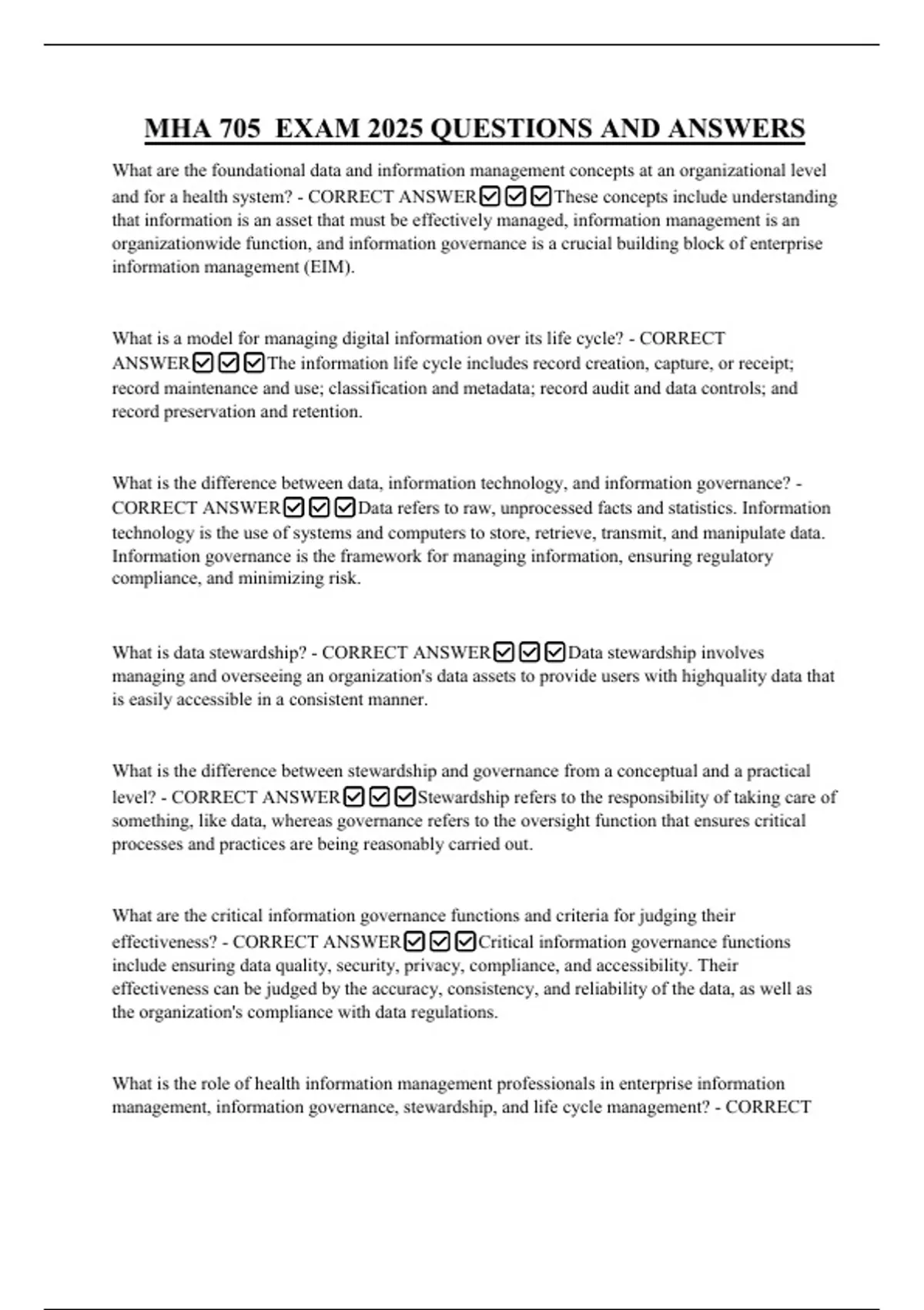 MHA 705 EXAM 2025 QUESTIONS AND ANSWERS What are the foundational data and information management concepts at an organizational level and for a health system? - CORRECT ANSWERThese concepts include understanding that information is an asset that must be effectively managed, information management is an organizationwide function, and information governance is a crucial building block of enterprise information management (EIM).