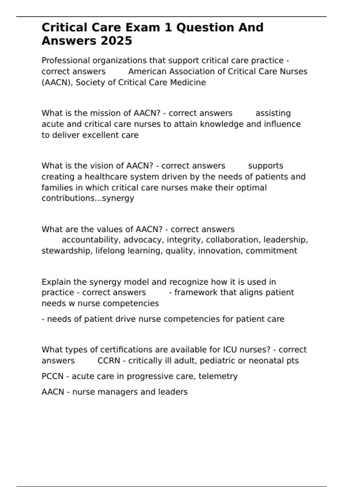 correct answers ✅✅American Association of Critical Care Nurses